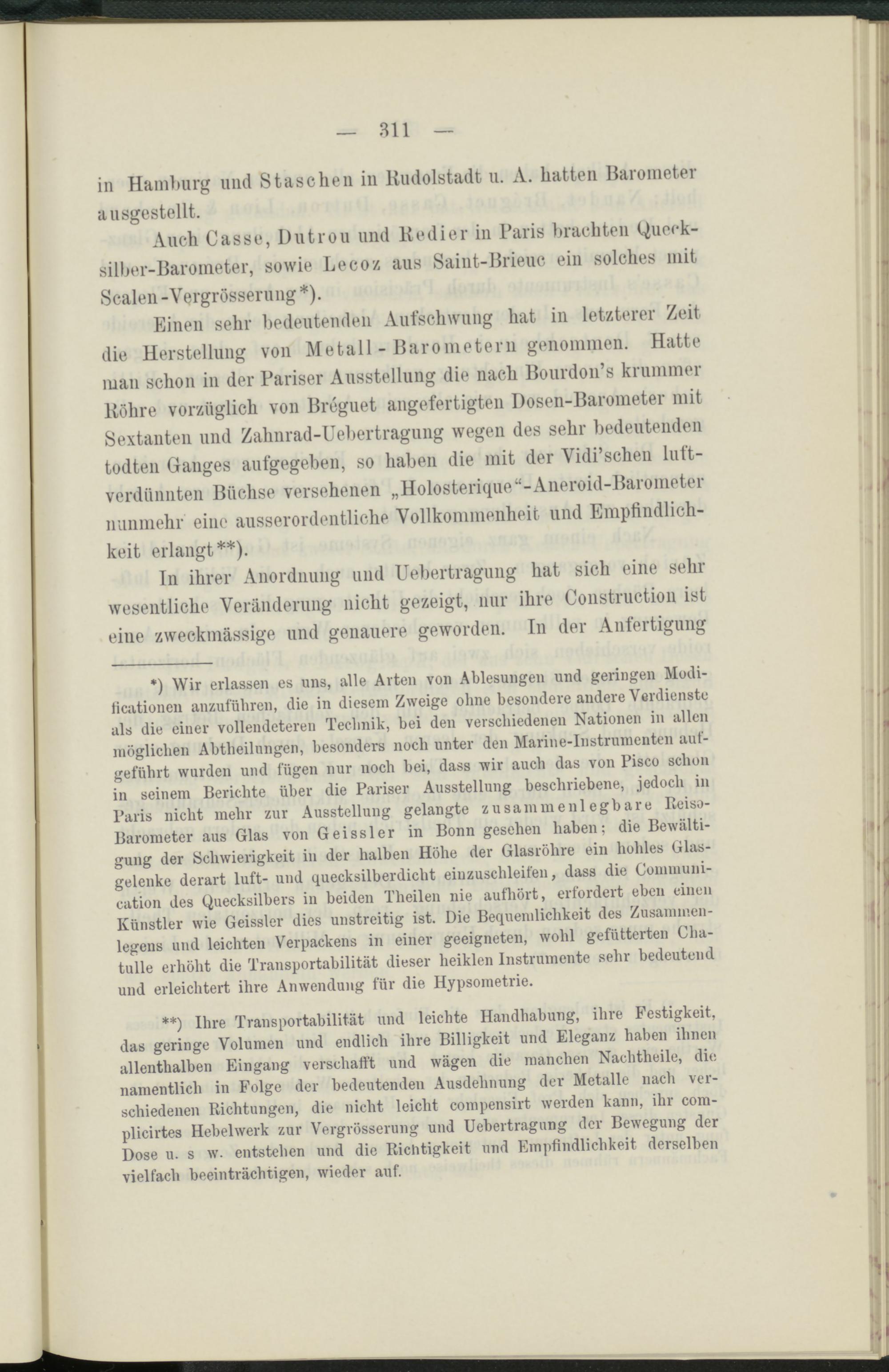 *) Wir erlassen es uns, alle Arten von Ablesungen und geringen Modi- licationen anzuführen, die in diesem Zweige ohne besondere andere Verdienste als die einer vollendeteren Technik, bei den verschiedenen Nationen in allen möglichen Abtheilnngen, besonders noch unter den Marine-Instrumenten auf- geführt wurden und lügen nur noch bei, dass wir auch das von Pisco schon in seinem Berichte über die Pariser Ausstellung beschriebene, jedoch in Paris nicht mehr zur Ausstellung gelangte zusammenlegbare Reiso- Barometer aus Glas von Geissler in Bonn gesehen haben; die Bewältigung der Schwierigkeit in der halben Höhe der Glasröhre ein hohles Glas- gelenke derart luft- und quecksilberdicht einzuschleifen, dass die Commum- cation des Quecksilbers in beiden Theilen nie aufhört, erfordert eben einen Künstler wie Geissler dies unstreitig ist. Die Bequemlichkeit des Zusammenlegens und leichten Verpackens in einer geeigneten, wohl gefütterten Cha- tulle erhöht die Transportabilität dieser heiklen Instrumente sehr bedeutend und erleichtert ihre Anwendung für die Hypsometrie.