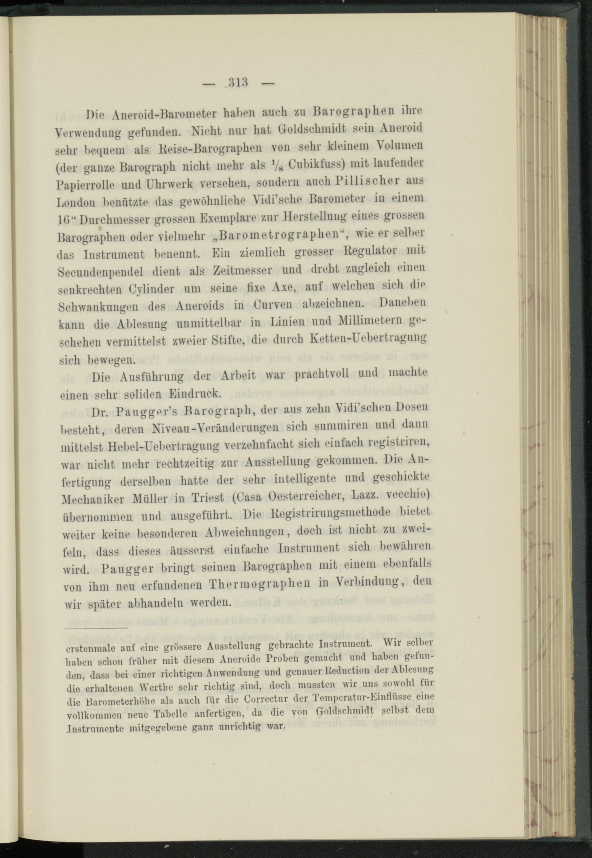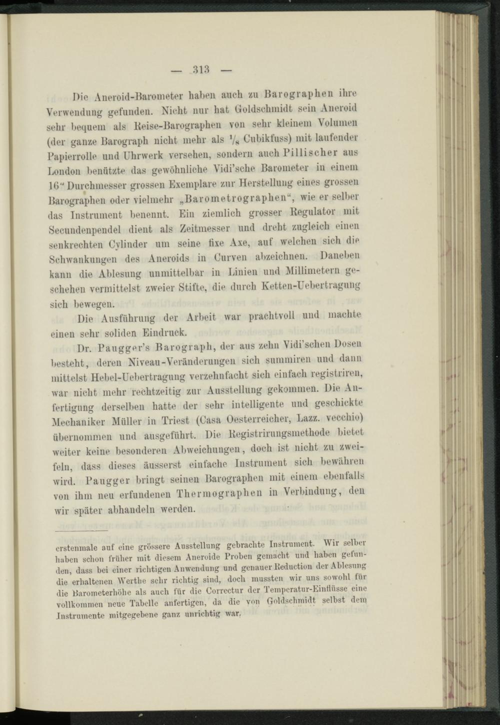 Dr. Paugger’s Barograph, der aus zehn Vidi’schen Dosen besteht, deren Niveau-Veränderungen sich summiren und dann mittelst Hebel-Uebertragung verzehnfacht sich einfach registriren, war nicht mehr rechtzeitig zur Ausstellung gekommen. Die Anfertigung derselben hatte der sehr intelligente und geschickte Mechaniker Müller in Triest (Casa Oesterreicher, Lazz. vecchio) übernommen und ausgefiihrt. Die Registrirungsmetliode bietet weiter keine besonderen Abweichungen, doch ist nicht zu zweifeln, dass dieses äusserst einfache Instrument sich bewähren wird. Paugger bringt seinen Barographen mit einem ebenfalls von ihm neu erfundenen Thermographen in Verbindung, den wir später abhandeln werden.