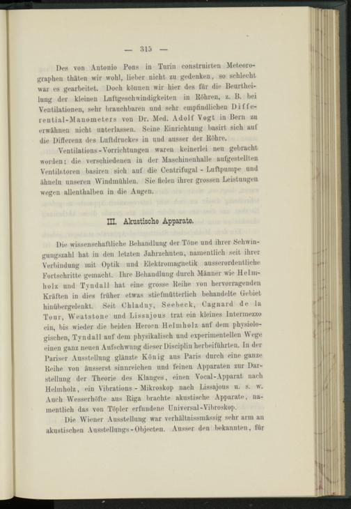 Die wissenschaftliche Behandlung der Töne und ihrer Schwingungszahl hat in den letzten Jahrzehnten, namentlich seit ihrer Verbindung mit Optik und Elektromagnetik ausserordentliche Fortschritte gemacht. Ihre Behandlung durch Männer wie Helm- holz und Tvndall hat eine grosse Keihe von hervorragenden Kräften in dies früher etwas stiefmütterlich behandelte Gebiet hinübergelenkt. Seit Ohladnv, Seebeck, Cagnard de la Tour, Weatstone und Lissajous trat ein kleines Intermezzo ein, bis wieder die beiden Heroen Helmholz auf dem physiologischen, Tvndall auf dem physikalisch und experimentellen Wege einen ganz neuen Aufschwung dieser Disciplin lierbeiführten. In der Pariser Ausstellung glänzte König aus Paris durch eine ganze Keihe von äusserst sinnreichen und feinen Apparaten zur Darstellung der Theorie des Klanges, einen Vocal-Apparat nach Helmholz, ein Vibrations - Mikroskop nach Lissajous u. s. w. Auch Wesserhöfte aus Riga brachte akustische Apparate, namentlich das von Töpler erfundene Universal-Vibroskop.