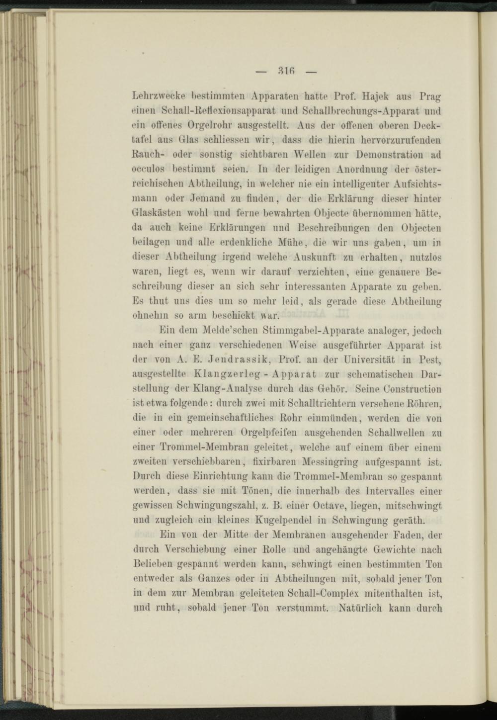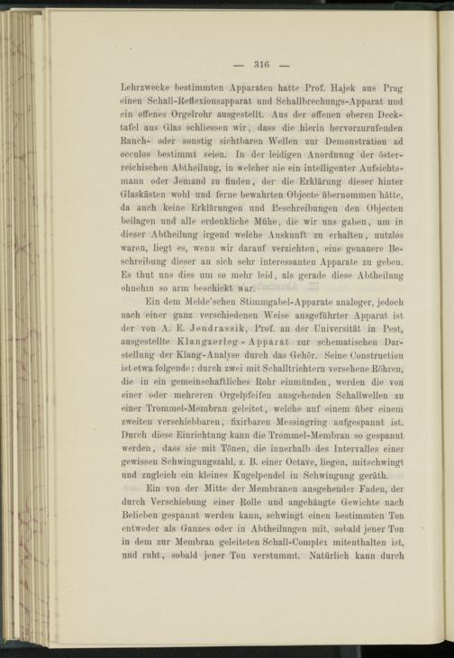 Lehrzwecke bestimmten Apparaten hatte Prof. Hajek aus Prag einen Schall-Refiexionsapparat und Schallbrechungs-Apparat und ein offenes Orgelrohr ausgestellt. Aus der offenen oberen Decktafel aus Glas schliessen wir, dass die hierin hervorzurufenden Rauch- oder sonstig sichtbaren Wellen zur Demonstration ad occulos bestimmt seien. In der leidigen Anordnung der österreichischen Abtheilung, in welcher nie ein intelligenter Aufsichtsmann oder Jemand zu finden, der die Erklärung dieser hinter Glaskästen wohl und ferne bewahrten Objecte übernommen hätte, da auch keine Erklärungen und Peschreibungen den Objecten beilagen und alle erdenkliche Mühe, die wir uns gaben, um in dieser Abtheilung irgend welche Auskunft, zu erhalten, nutzlos waren, liegt es, wenn wir darauf verzichten, eine genauere Beschreibung dieser an sich sehr interessanten Apparate zu geben. Es thut uns dies um so mehr leid, als gerade diese Abtheilung ohnehin so arm beschickt war.