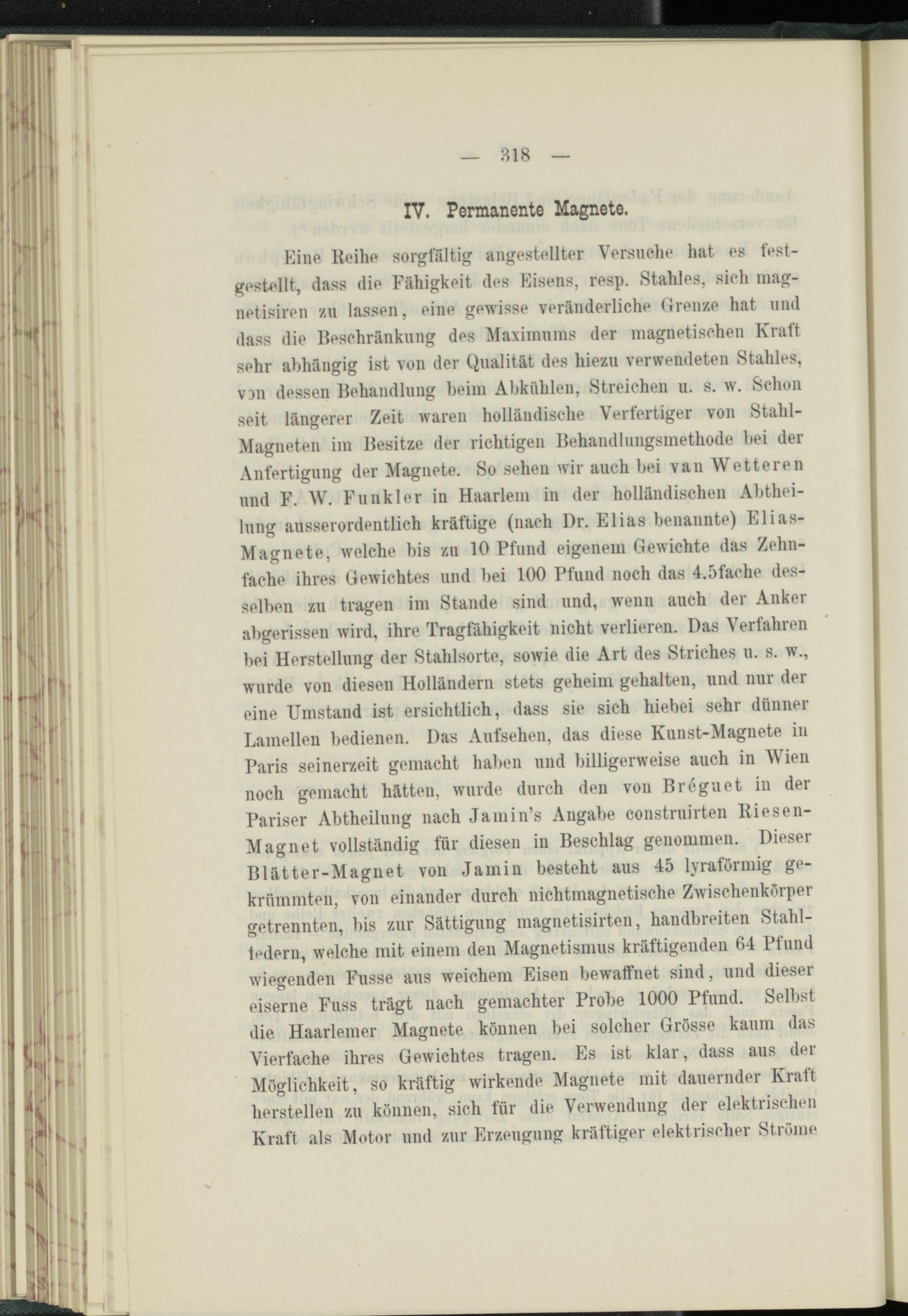Eine Reihe sorgfältig Angestellter Versuche hat es festgestellt, dass die Fähigkeit des Eisens, resp. Stahles, sich mag- netisiren zu lassen, eine gewisse veränderliche Grenze hat und dass die Beschränkung des Maximums der magnetischen Kraft sehr abhängig ist von der Qualität des hiezu verwendeten Stahles, von dessen Behandlung heim Abkühlen, Streichen u. s. w. Schon seit längerer Zeit waren holländische Verfertiger von Stahl- Magneten im Besitze der richtigen Behandlungsmethode bei der Anfertigung der Magnete. So sehen wir auch bei van Wetteren und F. W. Funkler in Haarlem in der holländischen Abtheilung ausserordentlich kräftige (nach Dr. Elias benannte) Elias- Magnete, welche bis zu 10 Pfund eigenem Gewichte das Zehnfache ihres Gewichtes und bei 100 Pfund noch das 4.5fache desselben zu tragen im Stande sind und, wenn auch der Anker abgerissen wird, ihre Tragfähigkeit nicht verlieren. Das Verfahren bei Herstellung der Stahlsorte, sowie die Art des Striches u. s. w., wurde von diesen Holländern stets geheim gehalten, und nur der eine Umstand ist ersichtlich, dass sie sich hiebei sehr dünner Lamellen bedienen. Das Aufsehen, das diese Kunst-Magnete in Paris seinerzeit gemacht haben und billigerweise auch in Wien noch gemacht hätten, wurde durch den von Bregnet in der Pariser Abtheilung nach Jamin’s Angabe construirten Riesen- Magnet vollständig für diesen in Beschlag genommen. Dieser Blätter-Magnet von Jam in besteht aus 45 lyraförmig gekrümmten, von einander durch nichtmagnetische Zwischenkörper getrennten, bis zur Sättigung magnetisirten, handbreiten Stahlfedern, welche mit einem den Magnetismus kräftigenden 64 Pfund wiegenden Fusse aus weichem Eisen bewaffnet sind, und dieser eiserne Fuss trägt nach gemachter Probe 1000 Pfund. Selbst die Haarlemer Magnete können bei solcher Grösse kaum das Vierfache ihres Gewichtes tragen. Es ist klar, dass aus der Möglichkeit, so kräftig wirkende Magnete mit dauernder Kraft lierstellen zu können, sich für die Verwendung der elektrischen Kraft als Motor und zur Erzeugung kräftiger elektrischer Ströme