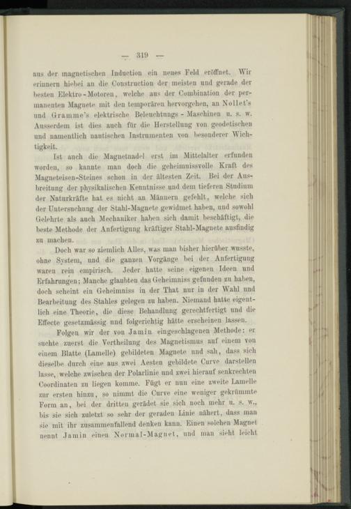 aus der magnetischen Tnduction ein neues Feld eröffnet. Wir erinnern hiebei an die Construction der meisten und gerade der besten Elektro - Motoren, welche aus der Combination der permanenten Magnete mit den temporären hervorgehen, an Nollet’s und üramme’s elektrische Beleuchtung« - Maschinen u. s. w. Ausserdem ist dies auch für die Herstellung von geodetischen und namentlich nautischen Instrumenten von besonderer Wichtigkeit.