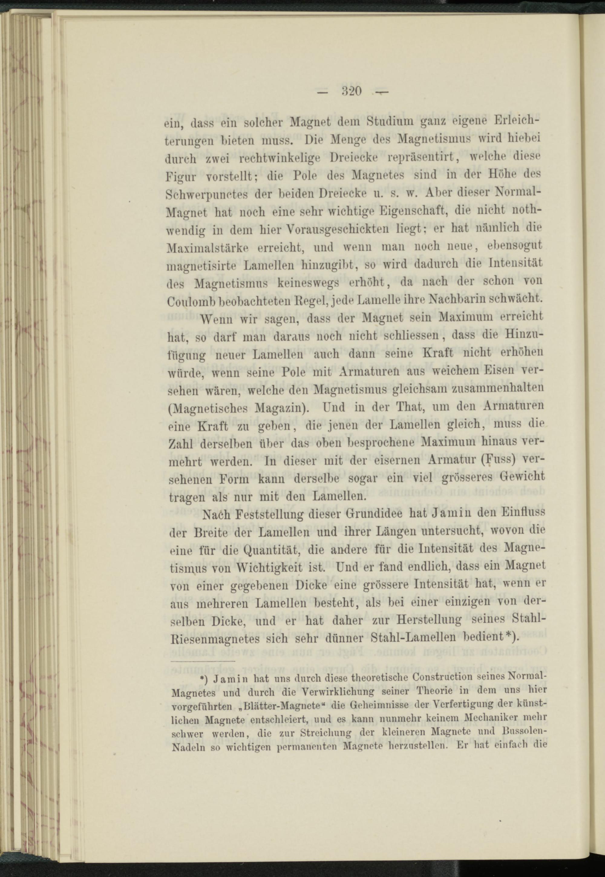 Nach Feststellung dieser Grundidee hat Jamin den Einfluss der Breite der Lamellen und ihrer Längen untersucht, wovon die eine für die Quantität, die andere für die Intensität des Magnetismus von Wichtigkeit ist. Und er fand endlich, dass ein Magnet von einer gegebenen Dicke eine grössere Intensität hat, wenn er aus mehreren Lamellen besteht, als bei einer einzigen von derselben Dicke, und er hat daher zur Herstellung seines Stahl- Riesenmagnetes sich sehr dünner Stahl-Lamellen bedient*).