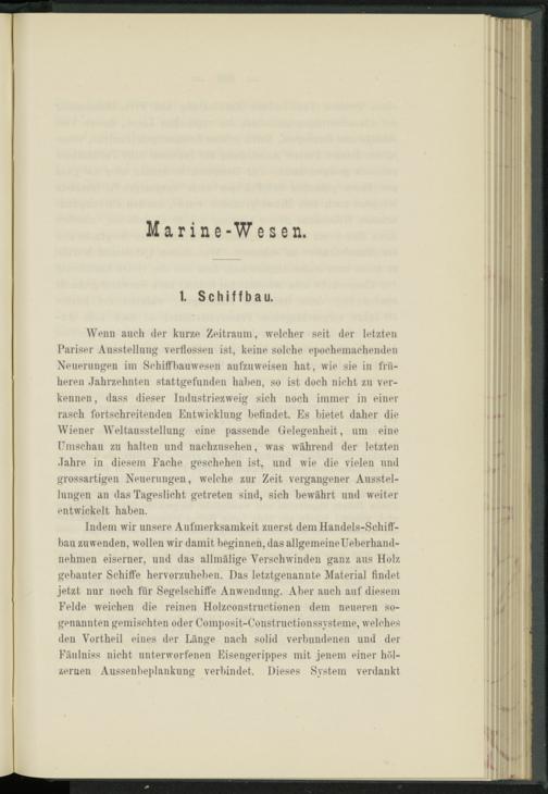 Wenn auch der kurze Zeitraum, welcher seit der letzten Pariser Ausstellung verflossen ist, keine solche epochemachenden Neuerungen im Schiffbauwesen aufzuweisen hat, wie sie in früheren Jahrzehnten stattgefunden haben, so ist doch nicht zu verkennen, dass dieser Industriezweig sich noch immer in einer rasch fortschreitenden Entwicklung befindet. Es bietet daher die Wiener Weltausstellung eine passende Gelegenheit, um eine Umschau zu halten und nachzusehen, was während der letzten Jahre in diesem Fache geschehen ist, und wie die vielen und grossartigen Neuerungen, welche zur Zeit vergangener Ausstellungen an das Tageslicht getreten sind, sich bewährt und weiter entwickelt haben.
