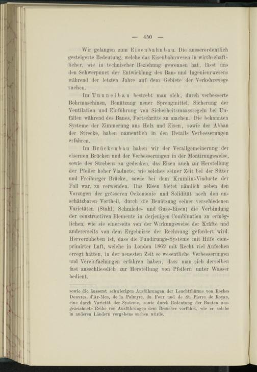 Im Brückenbau haben wir der Verallgemeinerung der eisernen Brücken und der Verbesserungen in der Montirungsweise, sowie des Strebens zu gedenken, das Eisen auch zur Herstellung der Pfeiler hoher Viaducte, wie solches seiner Zeit bei der Sitter und Freiburger Brücke, sowie bei dem Krumlin-Viaducte der Fall war, zu verwenden. Das Eisen bietet nämlich neben den Vorzügen der grösseren Ökonomie und Solidität noch den unschätzbaren Vortheil, durch die Benützung seiner verschiedenen Varietäten (Stahl, Schmiede- und Guss-Eisen) die Verbindung der constructiven Elemente in derjenigen Combination zu ermöglichen, wie sie einerseits von der Wirkungsweise der Kräfte und andererseits von dem Ergebnisse der Kechnung gefordert wird. Hervorzuheben ist, dass die Fundirungs-Systeme mit Hilfe com- primirter Luft, welche in London 1862 mit Recht viel Aufsehen erregt hatten, in der neuesten Zeit so wesentliche Verbesserungen und Vereinfachungen erfahren haben, dass man sich derselben fast ausschliesslich zur Herstellung von Pfeilern unter Wasser bedient.