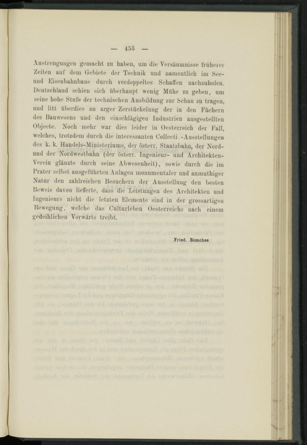 Anstrengungen gemacht zu haben, uni die Versäumnisse früherer Zeiten auf dem Gebiete der Technik und namentlich im See- und Eiseubahnbaue durch verdoppeltes» Schallen nachzuholen. Deutschland schien sich überhaupt wenig Miihe zu geben, um seine hohe Stufe der technischen Ausbildung zur Schau zu tragen, und litt überdies an arger Zerstückelung der in den Fächern des Bauwesens und den einschlägigen Industrien ausgestellten Objecte. Noch mehr war dies leider in Oesterreich der Fall, welches, trotzdem durch die interessanten Collecti.-Ausstellungen des k. k. Handels-Ministeriums, der österr. Staatsbahn, der Nord- und der Nordwestbahn (der österr. Ingenieur- und Architekten- Verein glänzte durch seine Abwesenheit), sowie durch die im Frater selbst ausgeführten Anlagen monumentaler und anmuthiger Natur den zahlreichen Besuchern der Ausstellung den besten Beweis davon lieferte, dass die Leistungen des Architekten und Ingenieurs nicht die letzten Elemente sind in der grossartigen Bewegung, welche das Culturleben Oesterreichs nach einem gedeihlichen Vorwärts treibt.