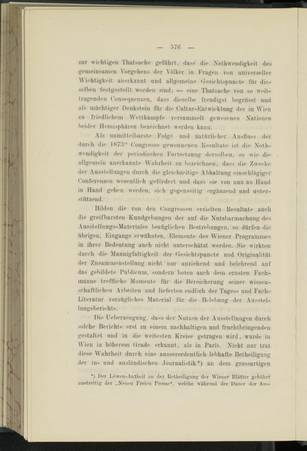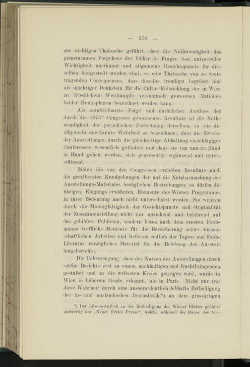 Die ITeberzeugung, dass der Nutzen der Ausstellungen durch solche Reriohte erst zu einem nachhaltigen und fruchtbringenden gestaltet und in die weitesten Kreise getragen wird, wurde in Wien in höherem (trade erkannt, als in Paris. Nicht nur trat diese Wahrheit durch eine ausserordentlich lebhafte Retheiligung der in- und ausländischen .Journalistik*) an dem grossartigen