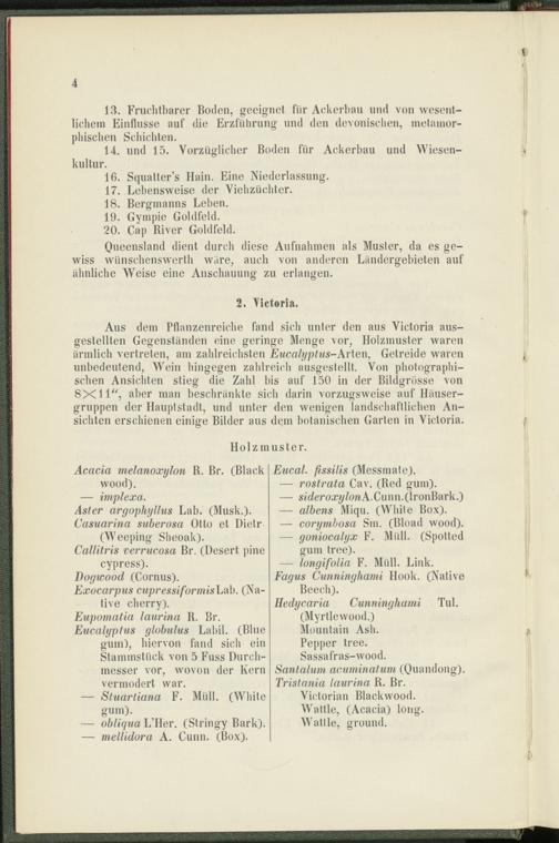 Aus dem Pflanzenreiche fand sich unter den aus Victoria ausgestellten Gegenständen eine geringe Menge vor, Holzmuster waren ärmlich vertreten, am zahlreichsten Eucalyptus- Arten, Getreide waren unbedeutend, Wein hingegen zahlreich ausgestellt. Von photographischen Ansichten stieg die Zahl bis auf 150 in der Bildgrösse von 8X11", aber man beschränkte sich darin vorzugsweise auf Häusergruppen der Hauptstadt, und unter den wenigen landschaftlichen Ansichten erschienen einige Bilder aus dem botanischen Garten in Victoria.