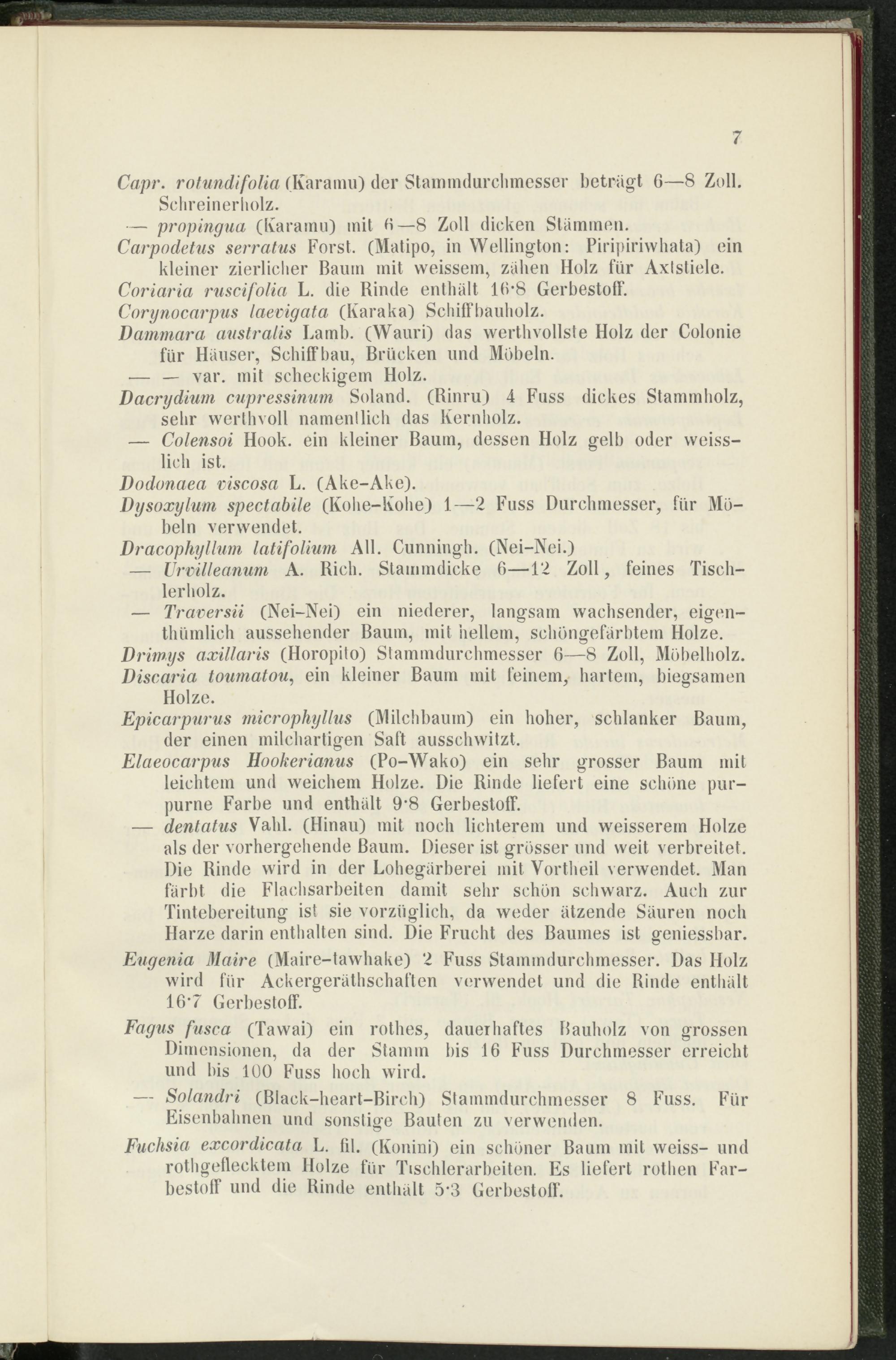 Fuchsia excordicata L. fil. (Konini) ein schöner Baum mit weiss- und rothgeflecktem Holze für Tischlerarbeiten. Es liefert rotlien Far- bestolf und die Rinde enthält 5'3 Gerhestoff.
