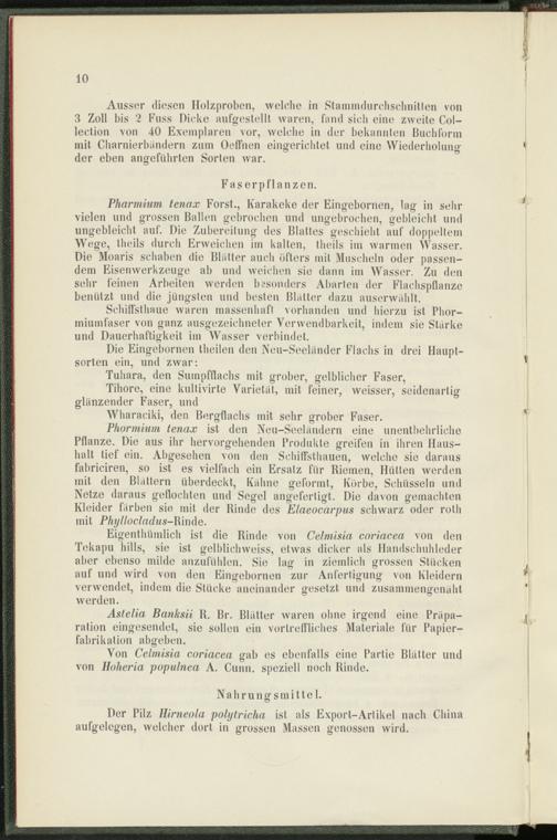 Pharmium tenax Forst., Karakeke der Eingebornen, lag in sehr vielen und grossen Ballen gebrochen und ungebrochen, gebleicht und ungebleicht auf. Die Zubereitung des Blattes geschieht auf doppeltem Wege, theils durch Erweichen im kalten, theils im warmen Wasser. Die Moaris schaben die Bliitter auch öfters mit Muscheln oder passendem Eisenwerkzeuge ab und weichen sie dann im Wasser. Zu den sehr feinen Arbeiten werden besonders Abarten der Fiachspllanze benützt und die jüngsten und besten Blatter dazu auserwählt.