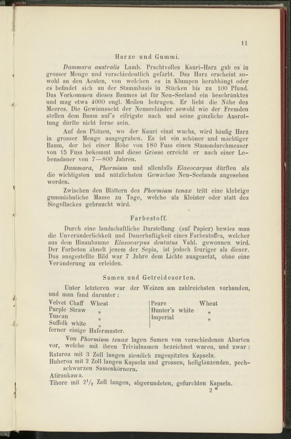 Auf den Plätzen, wo der Kauri einst wuchs, wird häufig Harz in grosser Menge ausgegraben. Es ist ein schöner und mächtiger Baum, der bei einer Höhe von 180 Fuss einen Stammdurchmesser von 15 Fuss bekommt und diese Grösse erreicht er nach einer Lebensdauer von 7—800 Jahren.