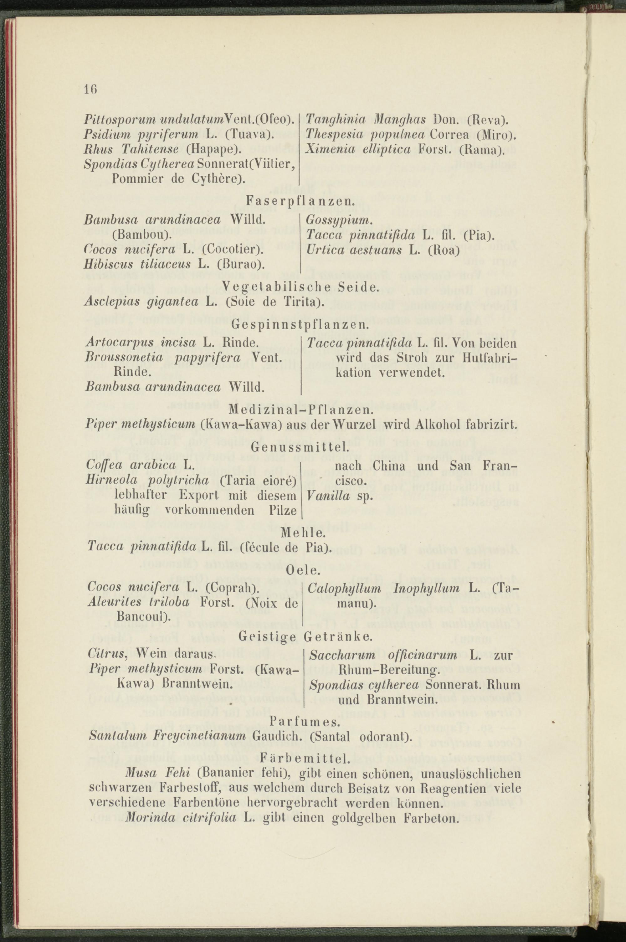 Musa Fehi (Bananier fehi), gibt einen schönen, unauslöschlichen schwarzen Farbestoff, aus welchem durch Beisatz von Reagentien viele verschiedene Farbentöne hervorgebracht werden können.