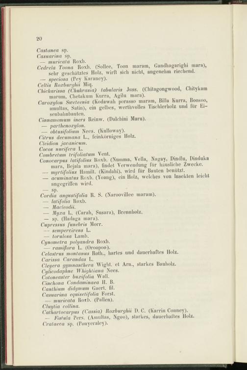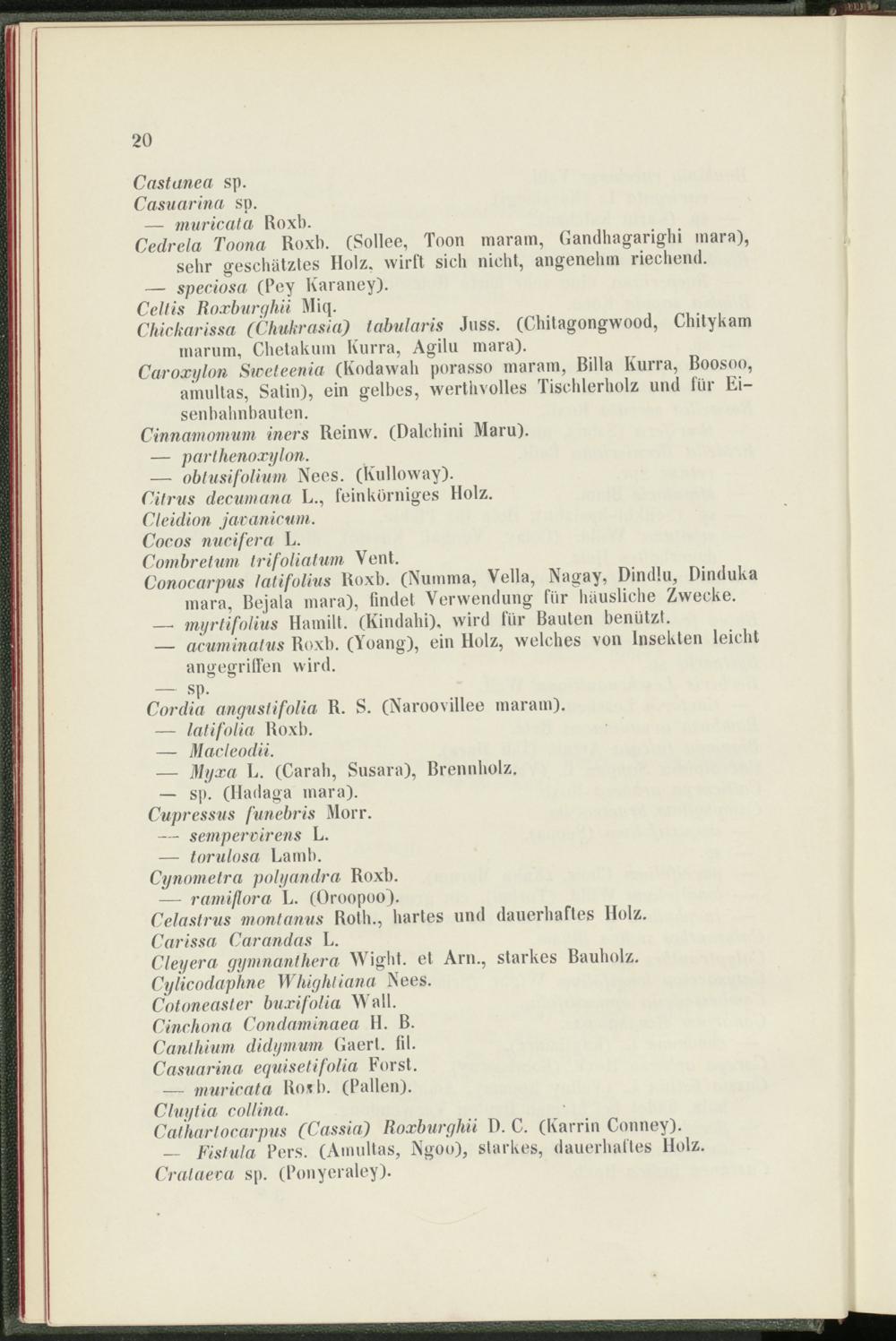 Cedrela Toona Roxb. (Sollee, Toon maram, Gandhagarighi mara), sehr geschätztes Holz, wirft sich nicht, angenehm riechend.