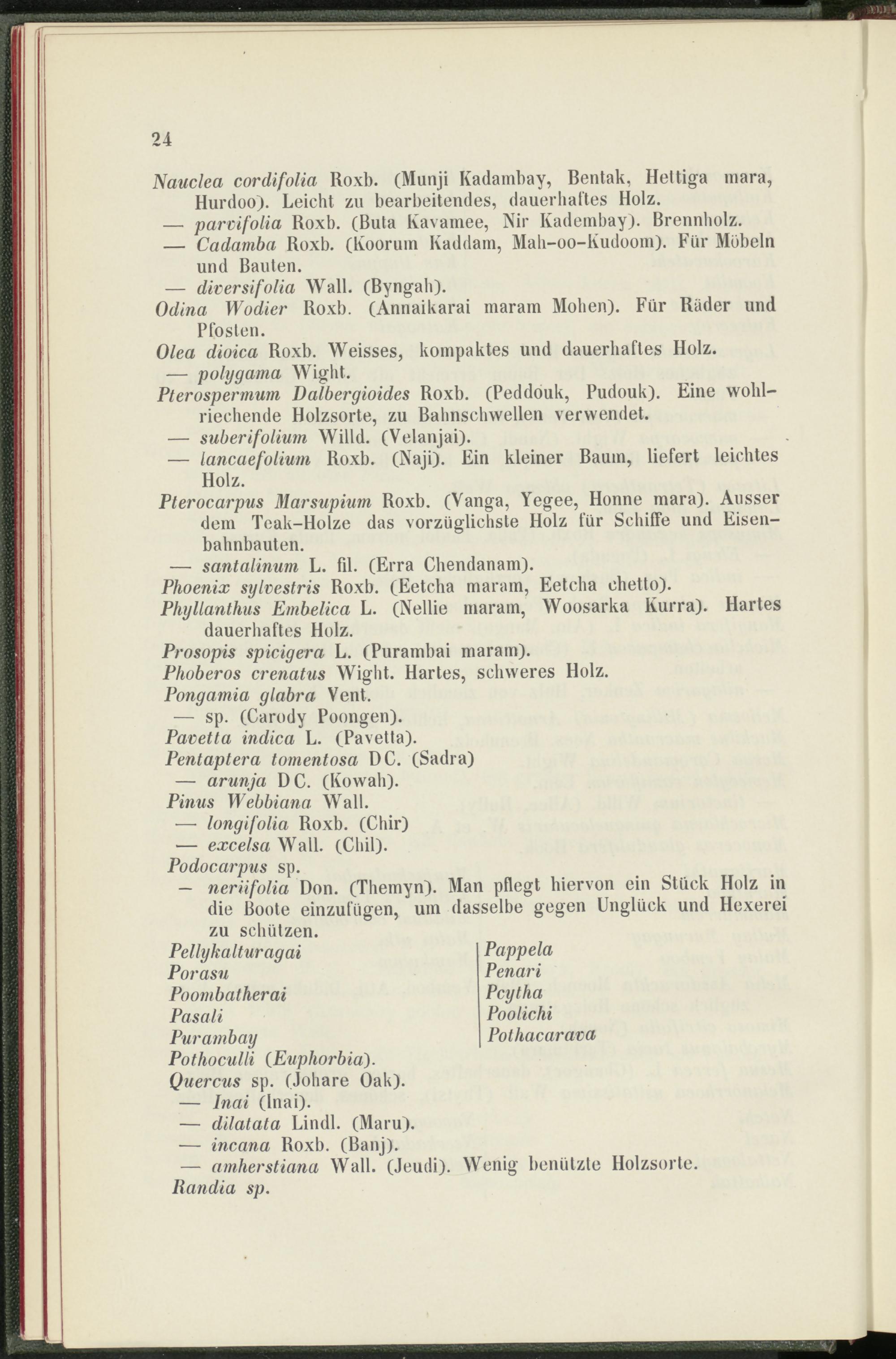 — Cadamba Roxb. (Koorum Kaddam, Mah-oo-Kudoom). Für Möbeln und Bauten.