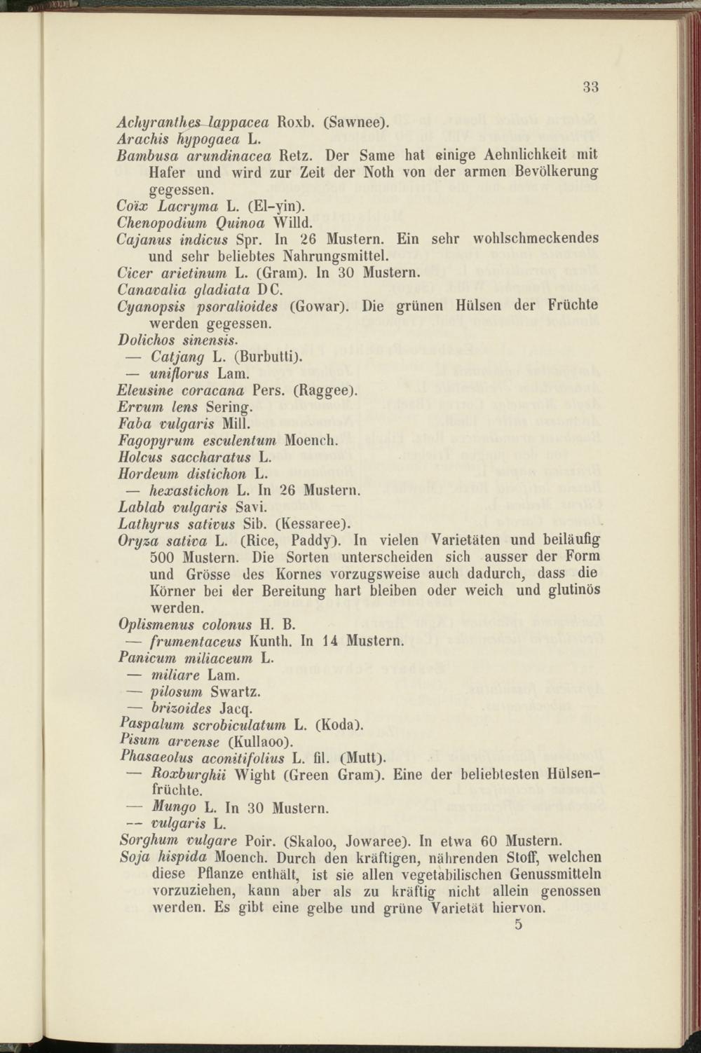 Oryza sativa L. (Rice, Paddy). In vielen Varietäten und beiläufig 500 Mustern. Die Sorten unterscheiden sich ausser der Form und Grösse des Kornes vorzugsweise auch dadurch, dass die Körner bei der Rereitung hart bleiben oder weich und glutinös werden.