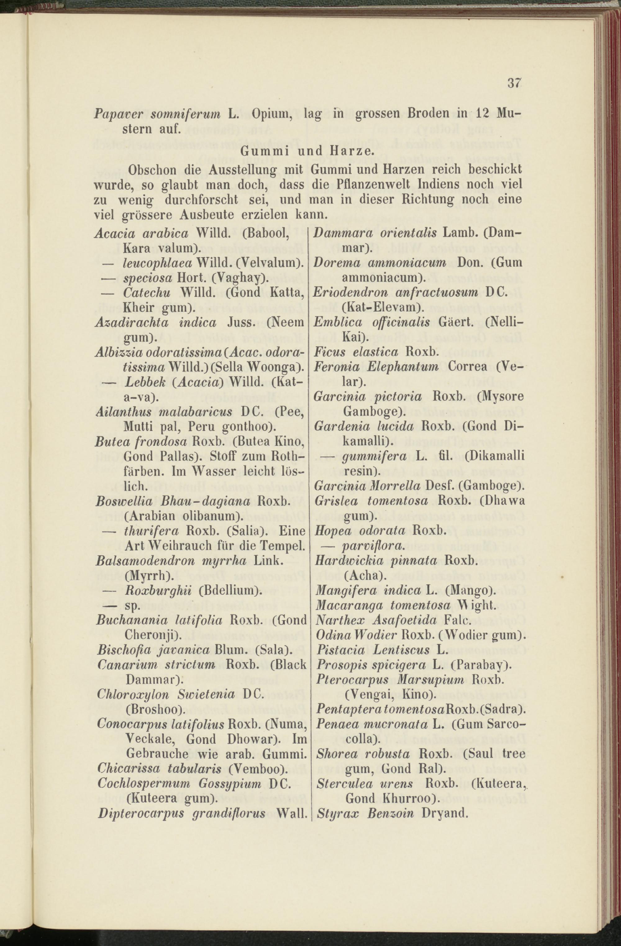 Obschon die Ausstellung mit Gummi und Harzen reich beschickt wurde, so glaubt man doch, dass die Pflanzenwelt Indiens noch viel zu wenig durchforscht sei, und man in dieser Richtung noch eine viel grössere Ausbeute erzielen kann.