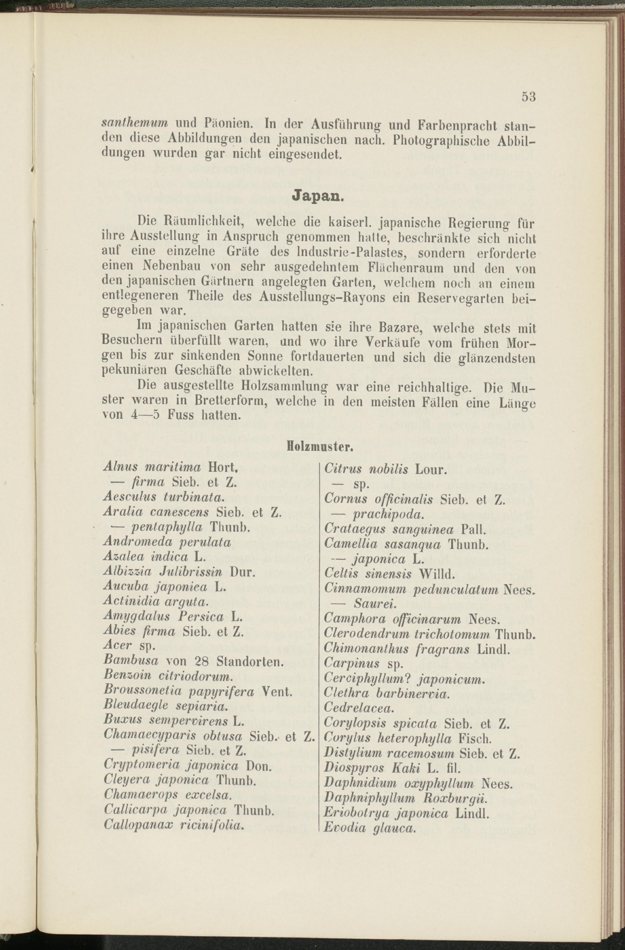 Die ausgestellte Holzsammlung war eine reichhaltige. Die Muster waren in Bretterform, welche in den meisten Fällen eine Länge von 4—5 Fuss hatten.