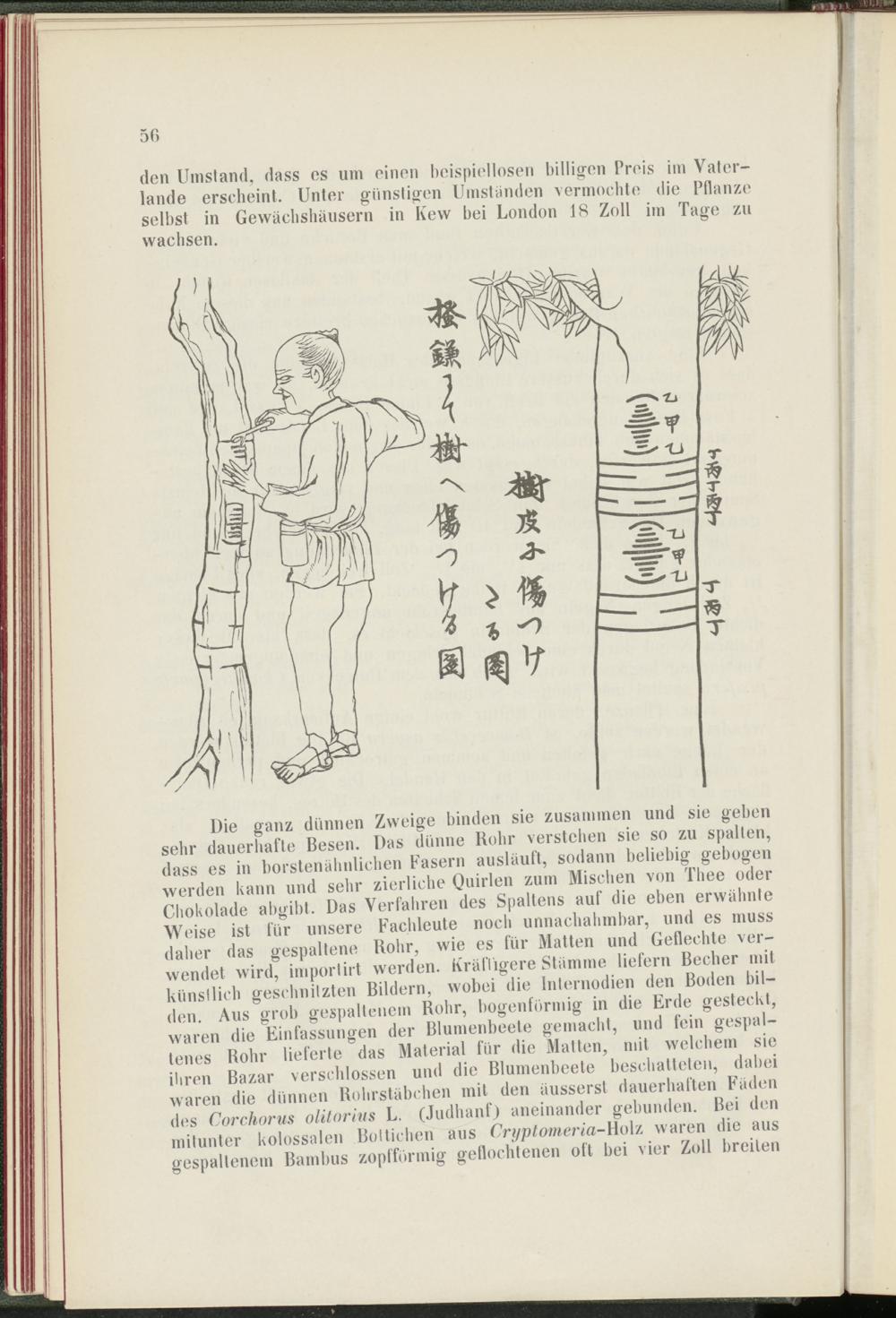 Die ganz dünnen Zweige binden sie zusammen und sie geben sehr dauerhafte Besen. Das dünne Rohr verstehen sie so zu spalten, dass es in borstenähnlichen Fasern ausläuft, sodann beliebig gebogen werden kann und sehr zierliche Quirlen zum Mischen von Thee oder Chokolade abgibt. Das Verfahren des Spaltens auf die eben erwähnte Weise ist für unsere Fachleute noch unnachahmbar, und es muss daher das gespaltene Rohr, wie es für Matten und Geflechte verwendet wird, importirt werden. Kräftigere Stämme liefern Becher mit künstlich geschnitzten Bildern, wobei die Internodien den Boden bilden. Aus grob gespaltenem Rohr, bogenförmig in die Erde gesteckt, waren die Einfassungen der Blumenbeete gemacht, und fein gespaltenes Rohr lieferte das Material für die Matten, mit welchem sie ihren Bazar verschlossen und die Blumenbeete beschatteten, dabei waren die dünnen Rohrstäbehen mit den äusserst dauerhaften Fäden des Corchorus oütorius L. (Judhanf) aneinander gebunden. Bei den mitunter kolossalen Bottichen aus Cryptomeria- Holz waren die aus gespaltenem Bambus zopfförmig geflochtenen oft bei vier Zoll breiten