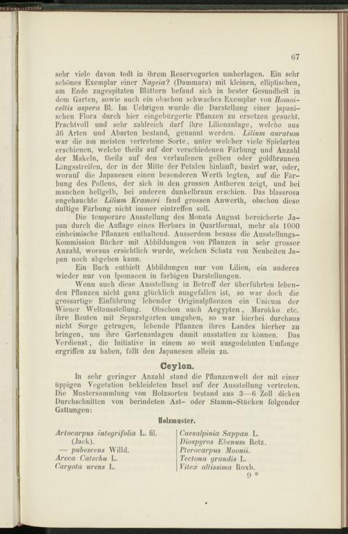 sehr viele davon todt in ihrem Reservegarten umherlagen. Ein sehr schönes Exemplar einer Nageia ? (Dammara) mit kleinen, elliptischen, am Ende zugespitzten Blättern befand sich in bester Gesundheit in dem Garten, sowie auch ein obschon schwaches Exemplar von Homoi- celtis aspera Bl. Im Uebrigen wurde die Darstellung einer japanischen Flora durch hier eingebürgerte Pflanzen zu ersetzen gesucht. Prachtvoll und sehr zahlreich darf ihre Lilienanlage, welche aus 36 Arten und Abarten bestand, genannt werden. Lilium auratum war die am meisten vertretene Sorte, unter welcher viele Spielarten erschienen, welche theils auf der verschiedenen Färbung und Anzahl der Makeln, theils auf den verlaufenen gelben oder goldbraunen Längsstreifen, der in der Mitte der Petalen hinläuft, basirt war, oder, worauf die Japanesen einen besonderen Werth legten, auf die Färbung des Pollens, der sich in den grossen Antheren zeigt, und bei manchen hellgelb, bei anderen dunkelbraun erschien. Das blassrosa angehauchte Lilium Krameri fand grossen Anwerth, obschon diese duftige Färbung nicht immer eintreffen soll.