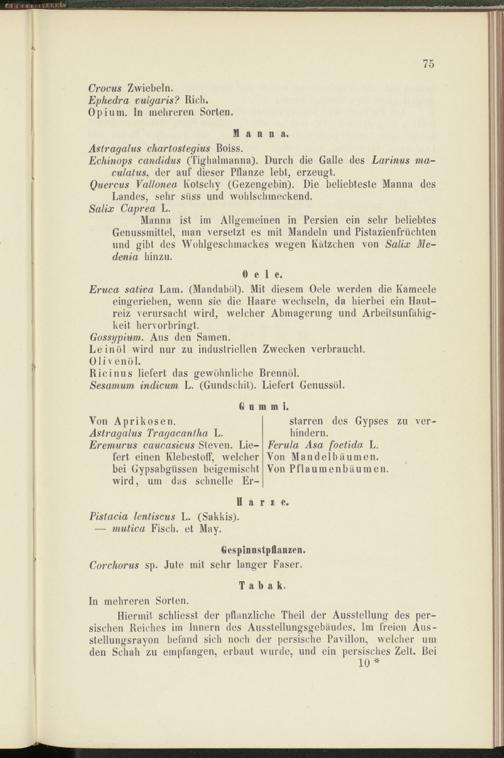 Hiermit schliesst der pflanzliche Theil der Ausstellung des persischen Reiches im Innern des Ausstellungsgebäudes, lin freien Ausstellungsrayon befand sich noch der persische Pavillon, welcher um den Schah zu empfangen, erbaut wurde, und ein persisches Zelt. Bei