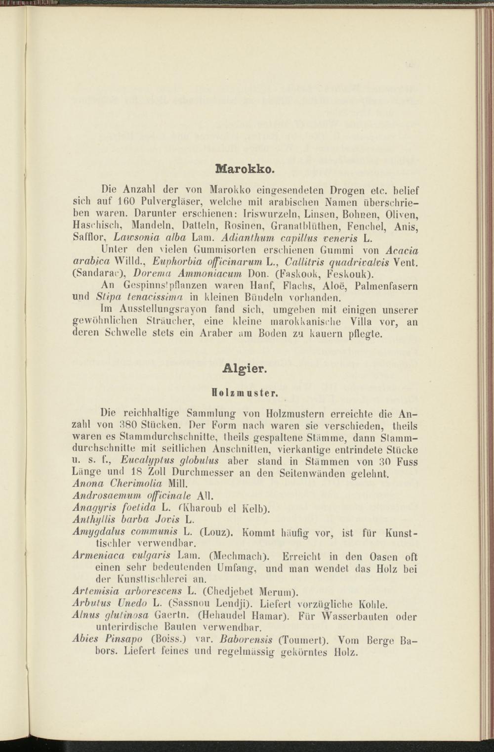 Die Anzahl der von Marokko eingesendeten Drogen etc. belief sich auf 160 Pulvergläser, welche mit arabischen Namen überschrieben waren. Darunter erschienen: Iriswurzeln, Linsen, Bohnen, Oliven, Haschisch, Mandeln, Datteln, Rosinen, Granatbliithen, Fenchel, Anis, Safflor, Lawsonia alba Lam. Adianthum capil/us veneris L.