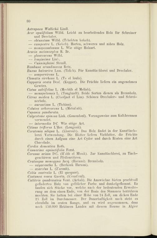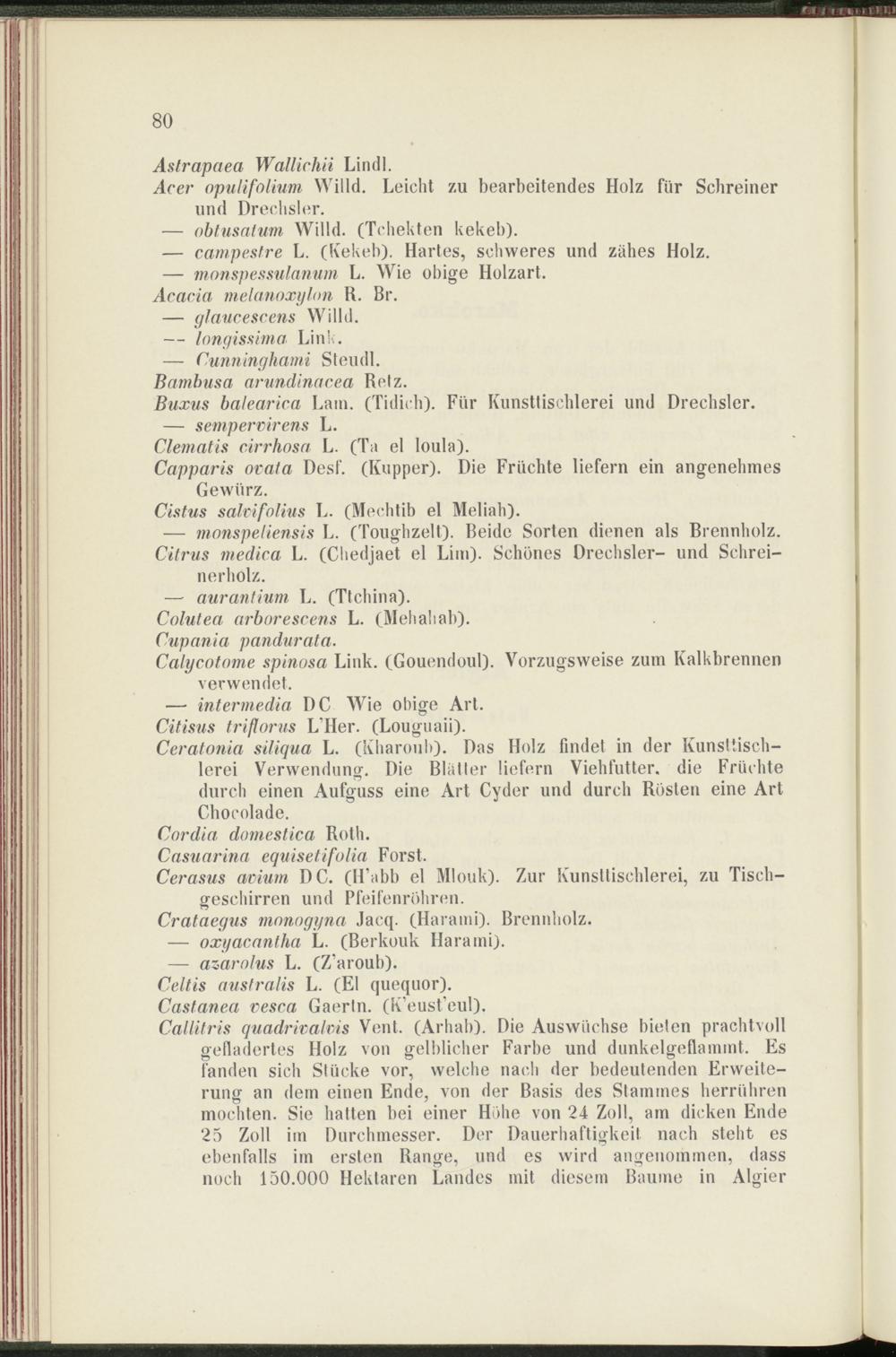 Callitris quadrivahis Vent. (Arhab). Die Auswüchse bieten prachtvoll gefladertes Holz von gelblicher Farbe und dunkelgeflammt. Es fanden sich Stücke vor, welche nach der bedeutenden Erweiterung an dem einen Ende, von der Basis des Stammes herrühren mochten. Sie hatten bei einer Höhe von 24 Zoll, am dicken Ende 25 Zoll im Durchmesser. Der Dauerhaftigkeit nach steht es ebenfalls im ersten Range, und es wird angenommen, dass noch 150.000 Hektaren Landes mit diesem Baume in Algier