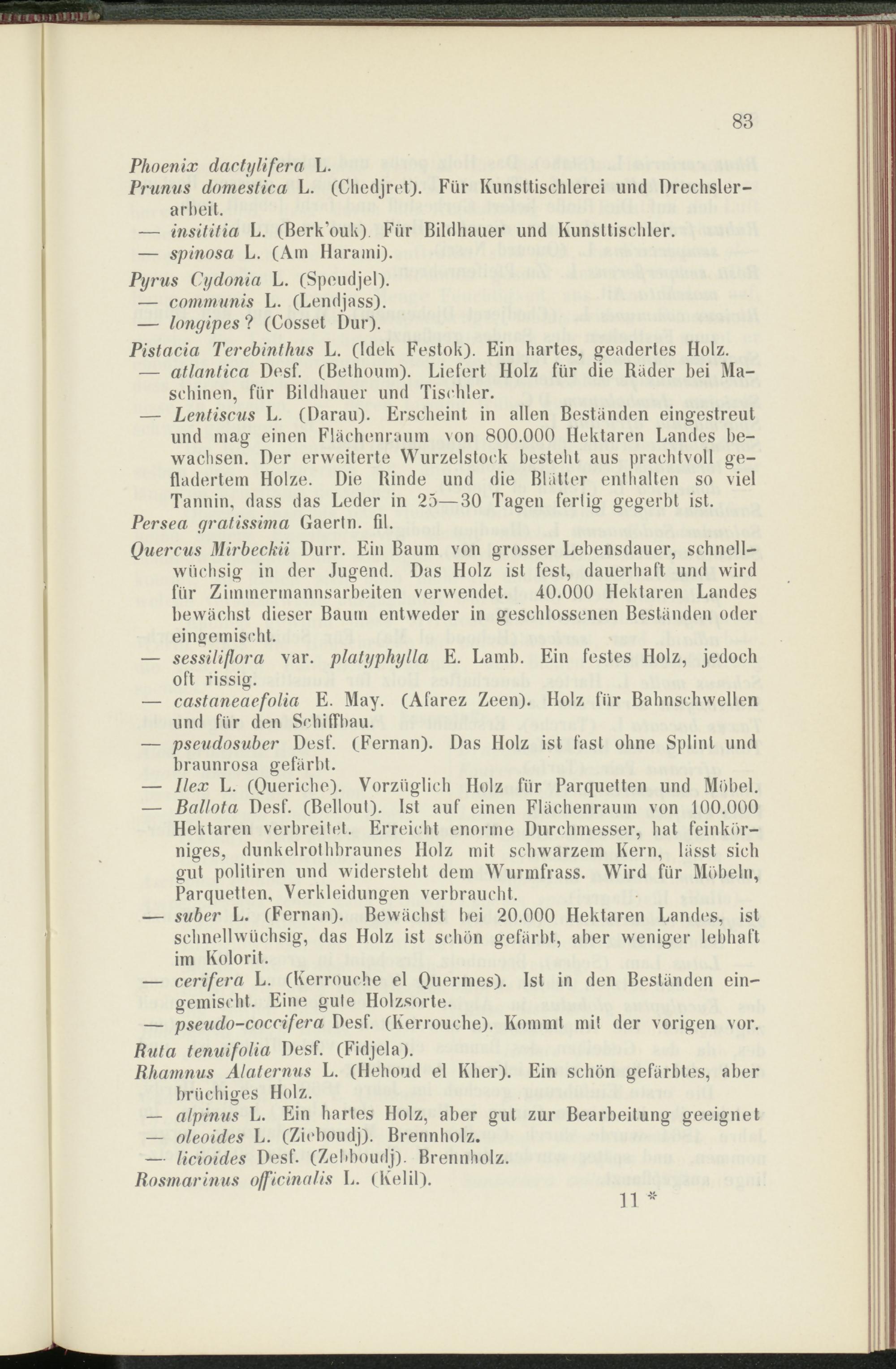 — Lentiscus L. (Darau). Erscheint in allen Bestanden eingestreut und mag einen Flächenraiun von 800.000 Hektaren Landes bewachsen. Der erweiterte Wurzelstock besteht aus prachtvoll ge- fladertem Holze. Die Rinde und die Blatter enthalten so viel Tannin, dass das Leder in 25—30 Tagen fertig gegerbt ist.