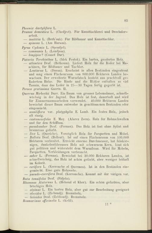 Quercus Mirbeckii Dürr. Ein Baum von grosser Lebensdauer, schnellwüchsig in der Jugend. Das Holz ist fest, dauerhaft und wird für Zimmermannsarbeiten verwendet. 40.000 Hektaren Landes bewachst dieser Baum entweder in geschlossenen Beständen oder eingemischt.