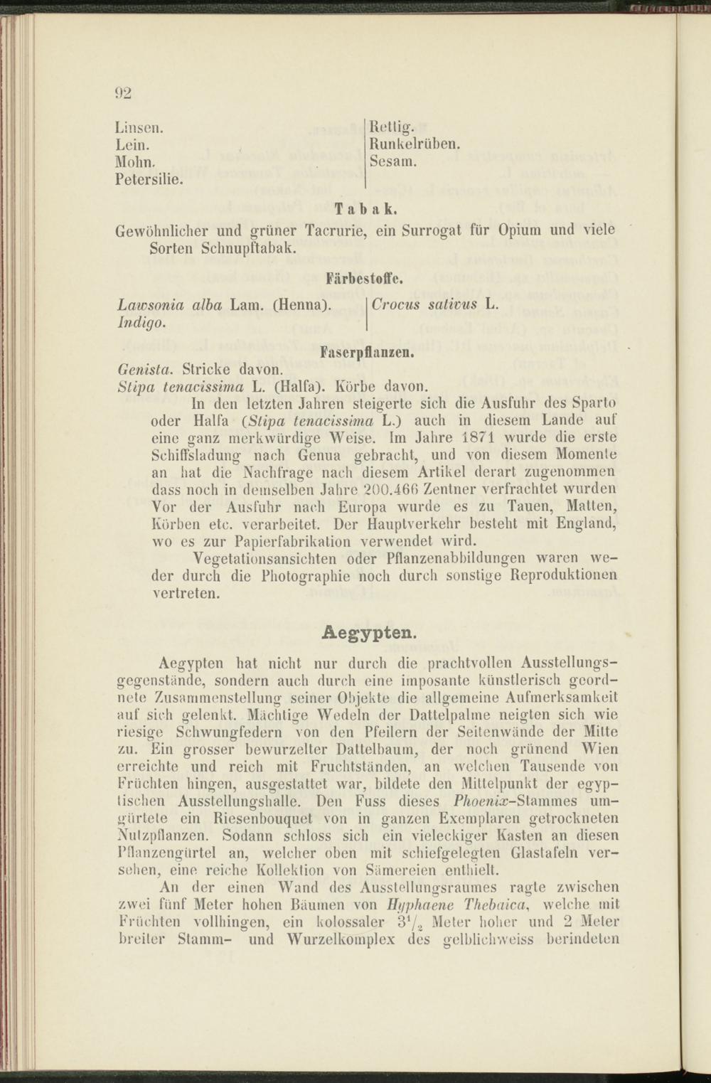 Aegypten hat nicht nur durch die prachtvollen Ausstellungsgegenstände, sondern auch durch eine imposante künstlerisch geordnete Zusammenstellung seiner Objekte die allgemeine Aufmerksamkeit auf sich gelenkt. Mächtige Wedeln der Dattelpalme neigten sich wie riesige Schwungfedern von den Pfeilern der Seitenwände der Mitte zu. Ein grosser bewurzelter Dattelbaum, der noch grünend Wien erreichte und reich mit Fruchtständen, an welchen Tausende von Früchten hingen, ausgestattet war, bildete den Mittelpunkt der egyp- tischen Ausstellungshalle. Den Fuss dieses Phoenix-Stummes umgürtete ein Riesenbouquet von in ganzen Exemplaren getrockneten Nutzpflanzen. Sodann schloss sich ein vieleckiger Kasten an diesen Pflanzengürtel an, welcher oben mit schiefgelegten Glastafeln versehen, eine reiche Kollektion von Sämereien enthielt.
