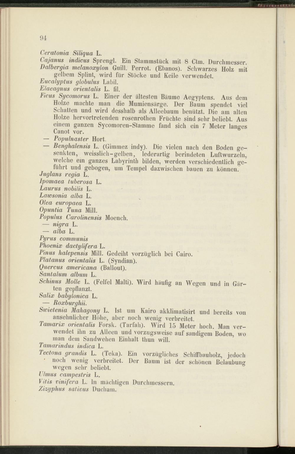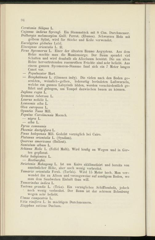 Swietenia Mahagony L. Ist um Kairo akklimatisirt und bereits von ansehnlicher Höhe, aber noch wenig verbreitet.
