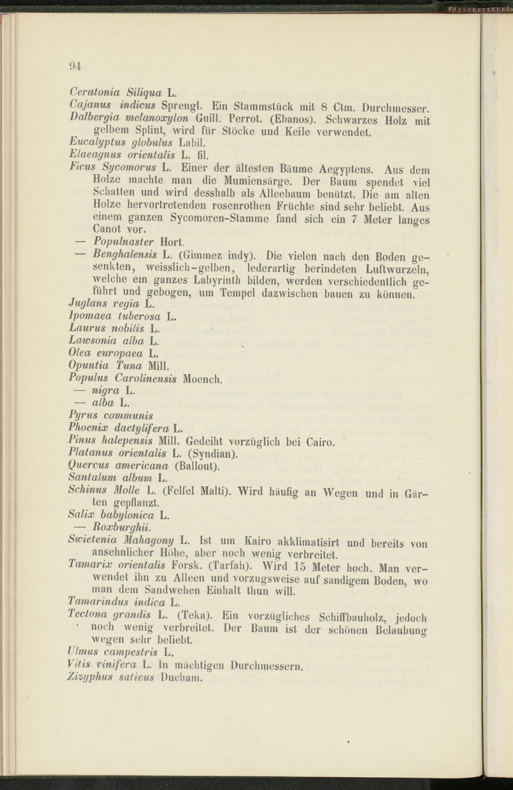 Ficus Sycomorus L. Einer der ältesten Bäume Aegyptens. Aus dem Holze machte man die Mumiensärge. Der Baum spendet viel Schatten und wird desshalb als Alleebaum benützt. Die am alten Holze hervortretenden rosenrothen Früchte sind sehr beliebt. Aus einem ganzen Sycomoren-Stamme fand sich ein 7 Meter langes Canot vor.