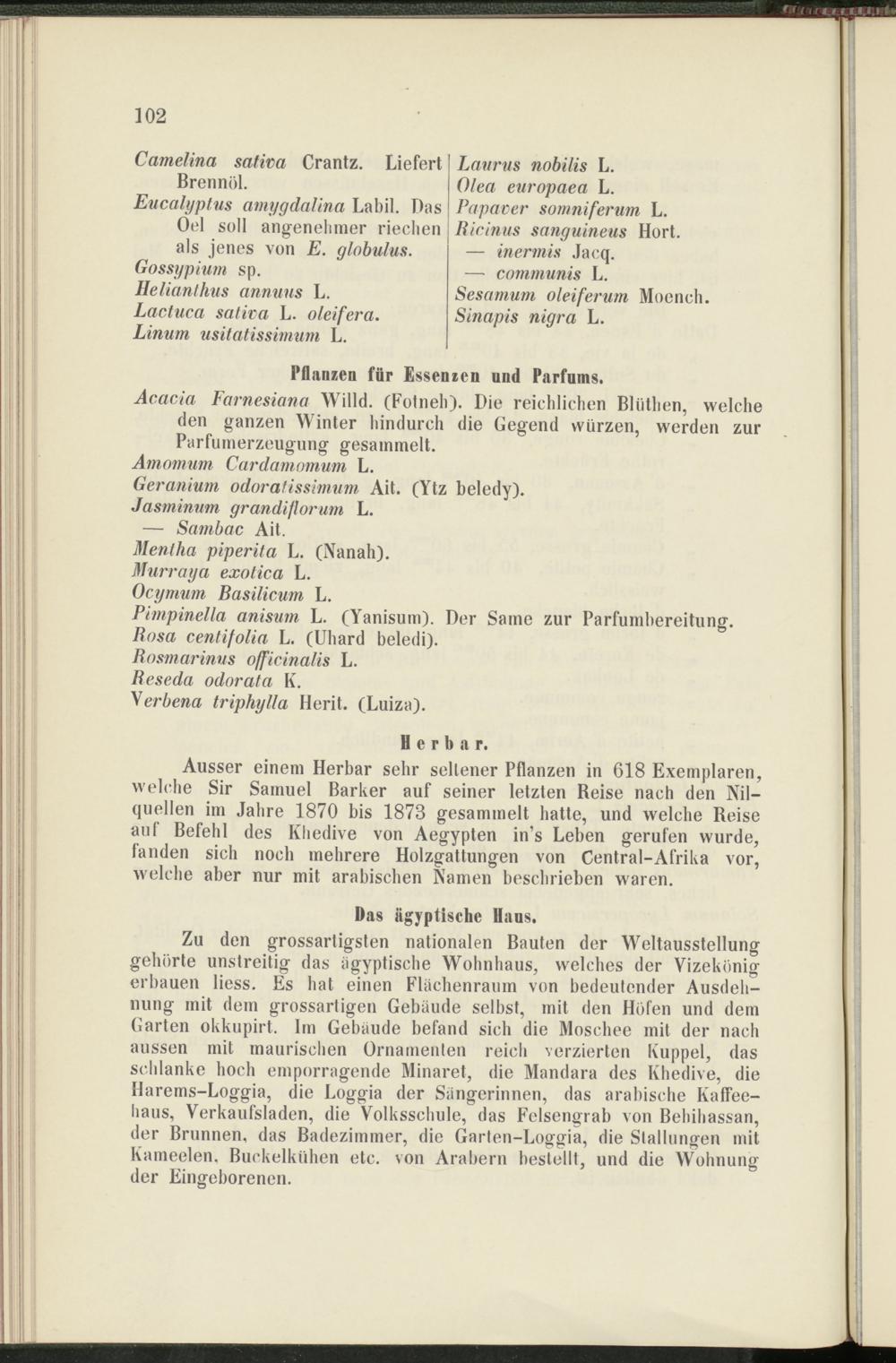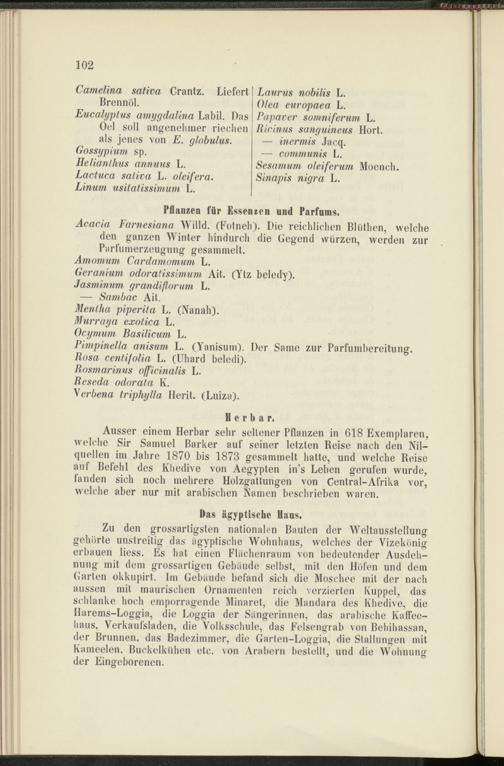 Ausser einem Herbar sehr seltener Pflanzen in 618 Exemplaren, welche Sir Samuel Barker auf seiner letzten Reise nach den Nilquellen im Jahre 1870 bis 1878 gesammelt hatte, und welche Reise auf Befehl des Khedive von Aegypten in’s Leben gerufen wurde, fanden sich noch mehrere Holzgattungen von Central-Afrika vor, welche aber nur mit arabischen Namen beschrieben waren.