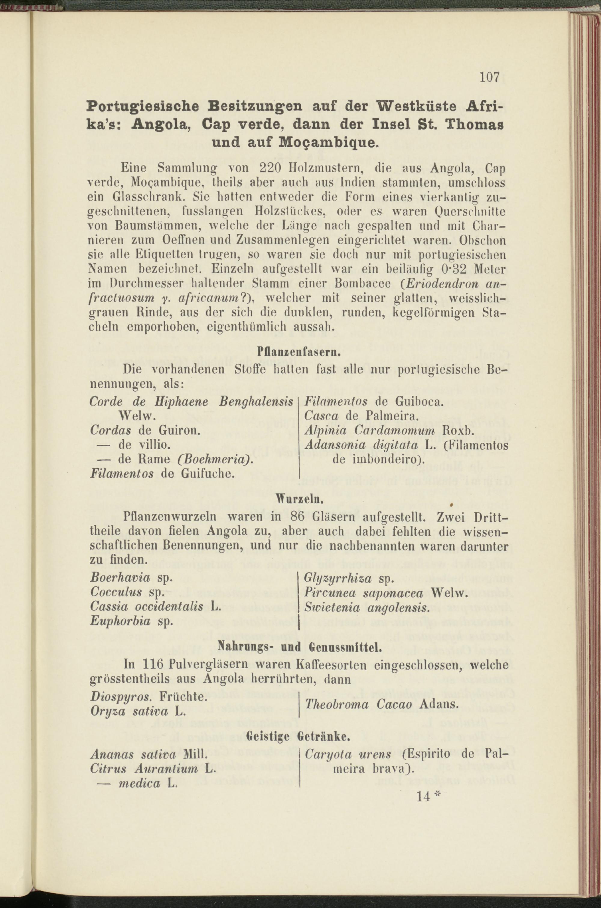 Eine Sammlung von 220 Holzmustern, die aus Angola, Cap verde, Mocambique, tlieils aber auch aus Indien stammten, umschloss ein Glasschrank. Sie hatten entweder die Form eines vierkantig zugeschnittenen, fusslangen Holzstückes, oder es waren Querschnitte von Baumstammen, welche der Länge nach gespalten und mit Cliar- nieren zum OefFnen und Zusammenlegen eingerichtet waren. Obschon sie alle Etiquetten trugen, so waren sie doch nur mit portugiesischen Namen bezeichnet. Einzeln aufgestellt war ein beiläufig 0’32 Meter im Durchmesser haltender Stamm einer Bombacee 0Eriodendrun an- fractuosum y. africanum ?), welcher mit seiner glatten, weisslich- grauen Binde, aus der sich die dunklen, runden, kegelförmigen Stacheln emporhoben, eigenthümlich aussah.