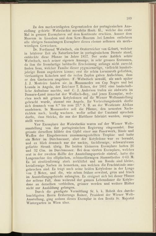 Zu den merkwürdigsten Gegenständen der portugiesischen Ausstellung gehörte Welwitschia mir ab Ms Hook, fil., welche das erste Mal in ganzen Exemplaren auf dem Kontinente erschien. Ausser dem Museum in Lissabon und dem Kew-Museum bei London entbehren alle übrigen Sammlungen Exemplare dieses ebenso seltenen als merkwürdigen Gewächses.