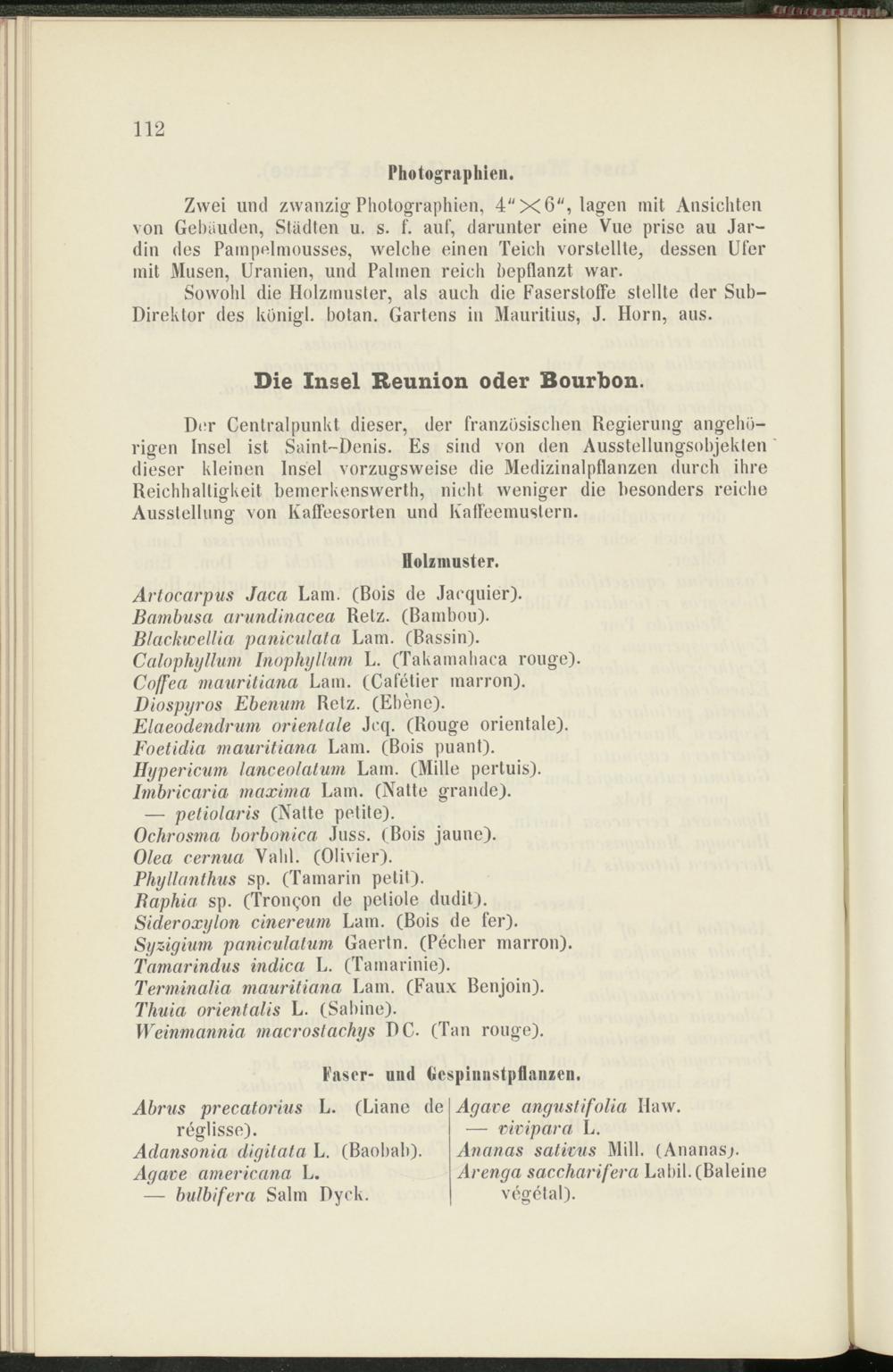 Sowohl die Holzmuster, als auch die Faserstoffe stellte der Sub- Direktor des künigl. botan. Gartens in Mauritius, J. Horn, aus.
