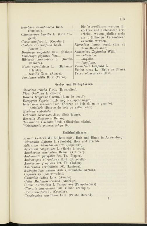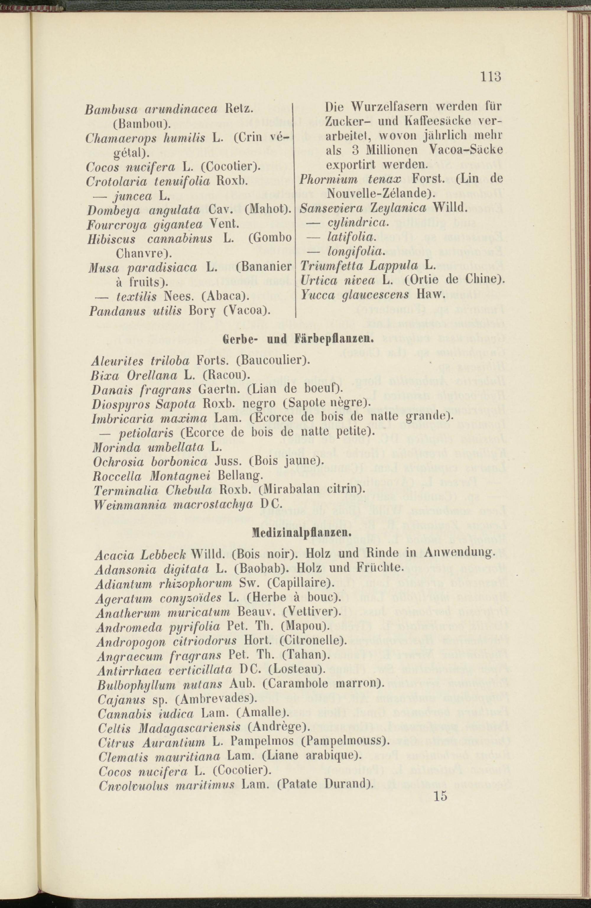 Die Wurzelfasern werden für Zucker- und Kalleesaeke verarbeitet, wovon jährlich mehr als 3 Millionen Vacoa-Sücke exportirt werden.