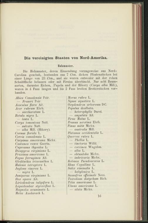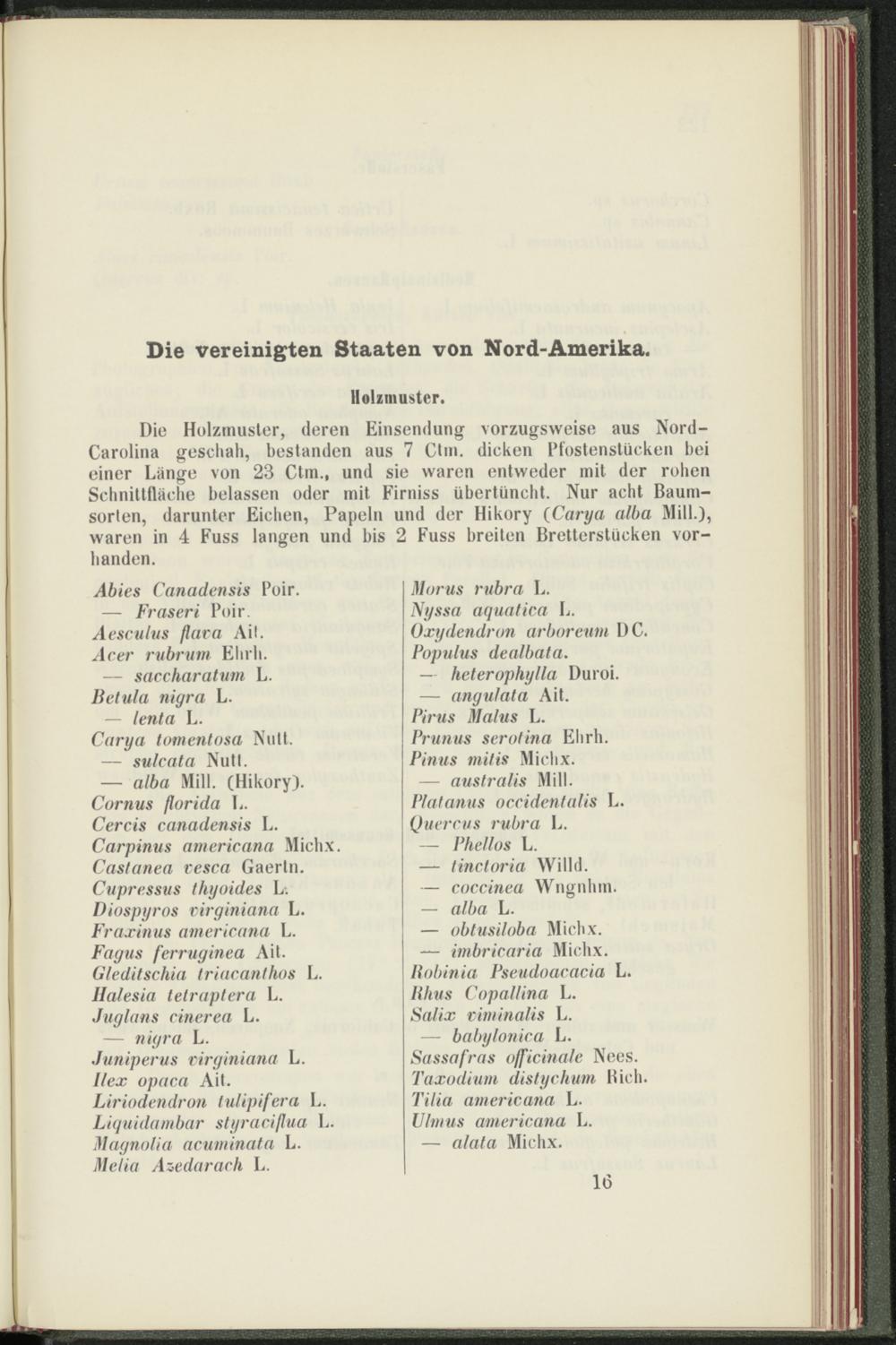 Die Holzmuster, deren Einsendung vorzugsweise aus Nord- Carolina geschah, bestanden aus 7 Ctm. dicken Pfostenstücken bei einer Länge von 23 Ctm., und sie waren entweder mit der rohen Schnittfläche belassen oder mit Firniss übertüncht. Nur acht Baumsorten, darunter Eichen, Papeln und der Hikory (Carya alba Mill.), waren in 4 Fuss langen und bis 2 Fuss breiten Bretterstücken vorhanden.