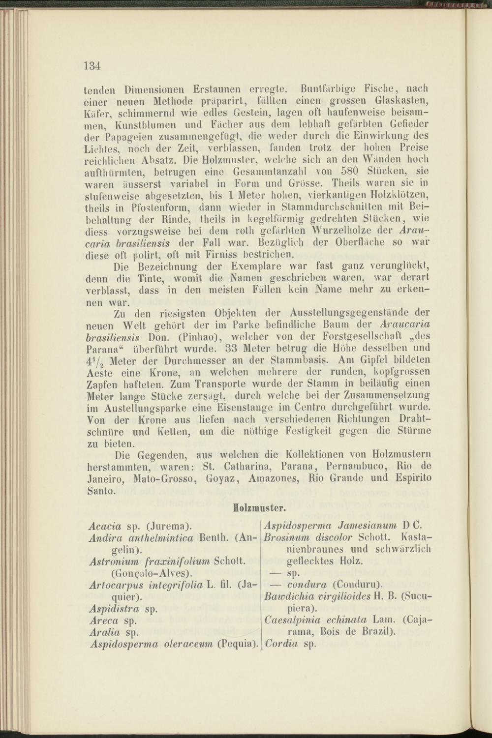 tenden Dimensionen Erstaunen erregte. Buntfarbige Fische, nach einer neuen Methode priiparirt, füllten einen grossen Glaskasten, Käfer, schimmernd wie edles Gestein, lagen oft haufenweise beisammen, Kunstblumen und Fächer aus dem lebhaft gefärbten Gefieder der Papageien zusammengefügt, die weder durch die Einwirkung des Lichtes, noch der Zeit, verblassen, fanden trotz der hohen Preise reichlichen Absatz. Die Holzmuster, welche sich an den Wänden hoch aufthiirmlen, betrugen eine Gesainmtanzahl von 580 Stücken, sie waren üusserst variabel in Form und Grosse. Theils waren sie in stufenweise abgesetzten, bis 1 Meter hohen, vierkantigen Holzklotzen, theils in Pfostenform, dann wieder in Slammdurehsehnilten mit Beibehaltung der Rinde, theils in kegelförmig gedrehten Stücken, wie diess vorzugsweise bei dem roth gefärbten Wurzelholze der Arau - caria brasüiensis der Fall war. Bezüglich der Oberfläche so war diese oft polirt, oft mit Firniss bestrichen.