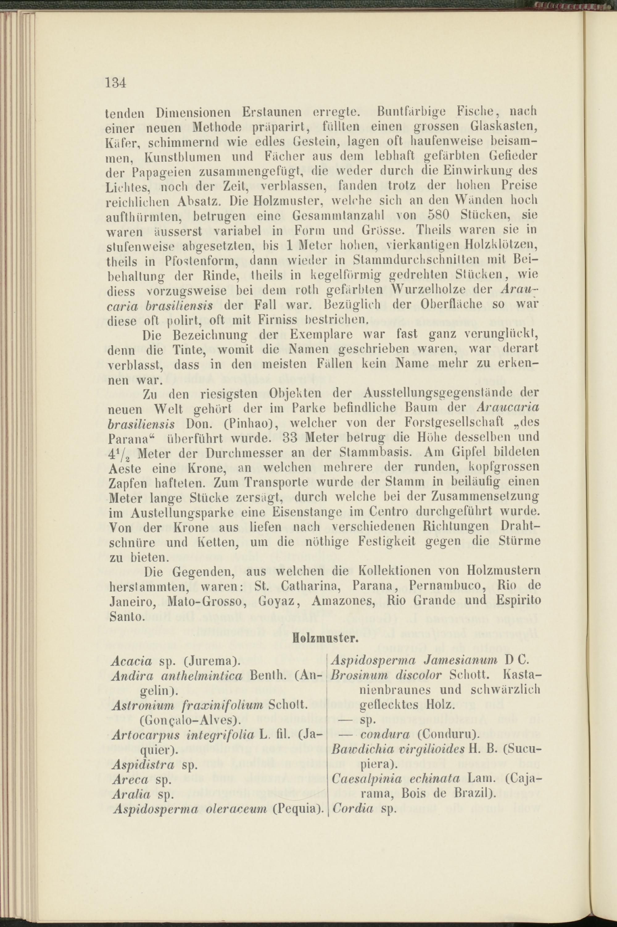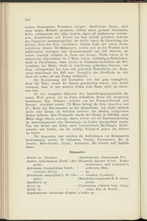 Die Gegenden, aus welchen die Kollektionen von Holzmustern herstammten, waren: St. Catharina, Parana, Pernambuco, Rio de Janeiro, Mato-Grosso, Goyaz, Amazones, Rio Grande und Espirito Santo.
