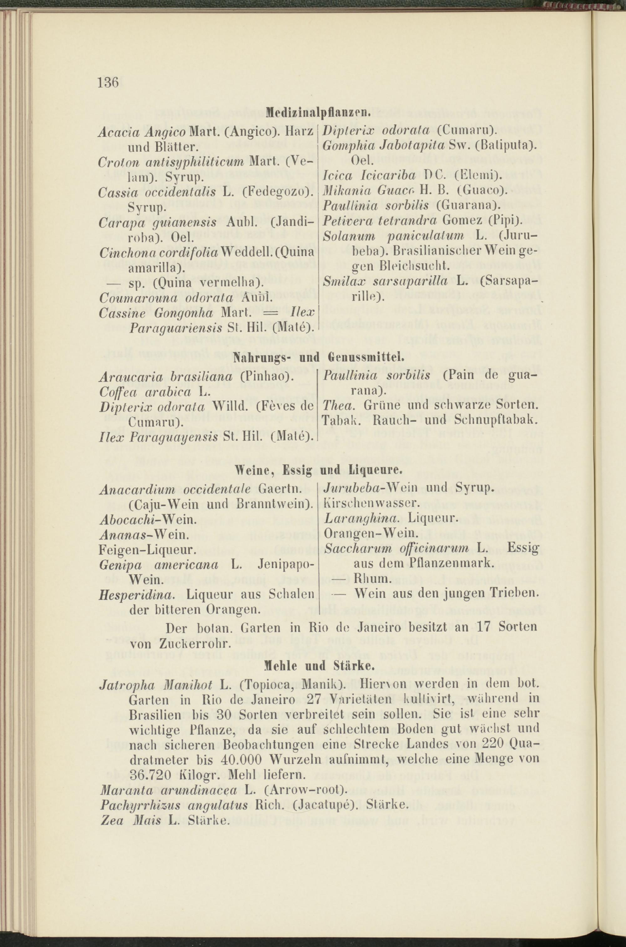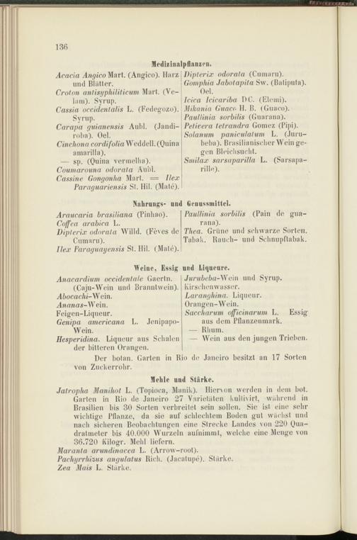 Jatropha Manihot L. (Topioca, Manik). Hiervon werden in dem bot. Garten in Rio de Janeiro 27 Varietäten kullivirt, während in Brasilien bis 30 Sorten verbreitet sein sollen. Sie ist eine sehr wichtige Pflanze, da sie auf schlechtem Boden gut wächst und nach sicheren Beobachtungen eine Strecke Landes von 220 Quadratmeter bis 40.000 Wurzeln aufnimmt, welche eine Menge von 36.720 Kilogr. Mehl liefern.