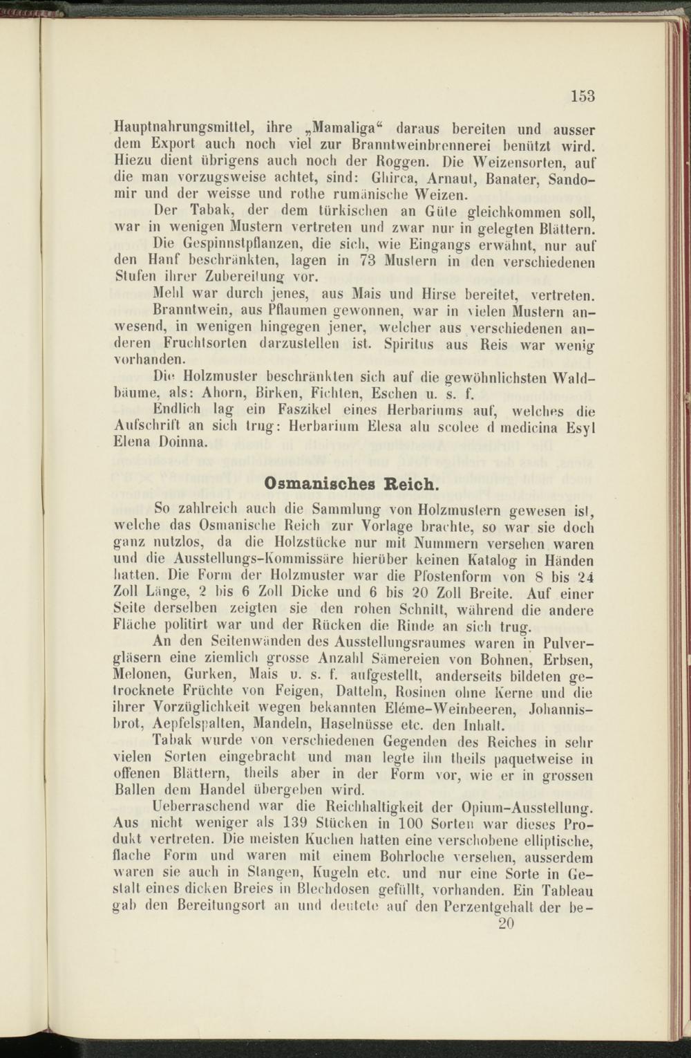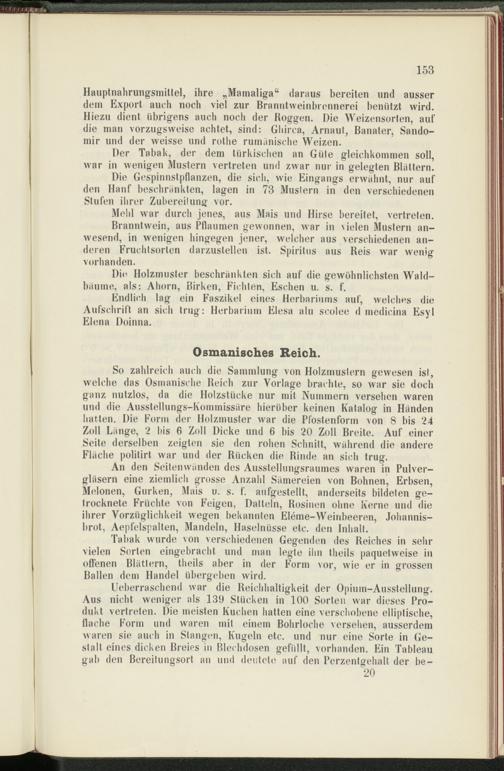 So zahlreich auch die Sammlung von Holzmustern gewesen ist, welche das Osmanische Reich zur Vorlage brachte, so war sie doch ganz nutzlos, da die Holzstücke nur mit Nummern versehen waren und die Ausstellungs-Kommissäre hierüber keinen Katalog in Händen hatten. Die Form der Holzmuster war die Pfostenform von 8 bis 24 Zoll Länge, 2 bis 6 Zoll Dicke und 6 bis 20 Zoll Breite. Auf einer Seite derselben zeigten sie den rohen Schnitt, während die andere Fläche politirt war und der Rücken die Rinde an sich trug.