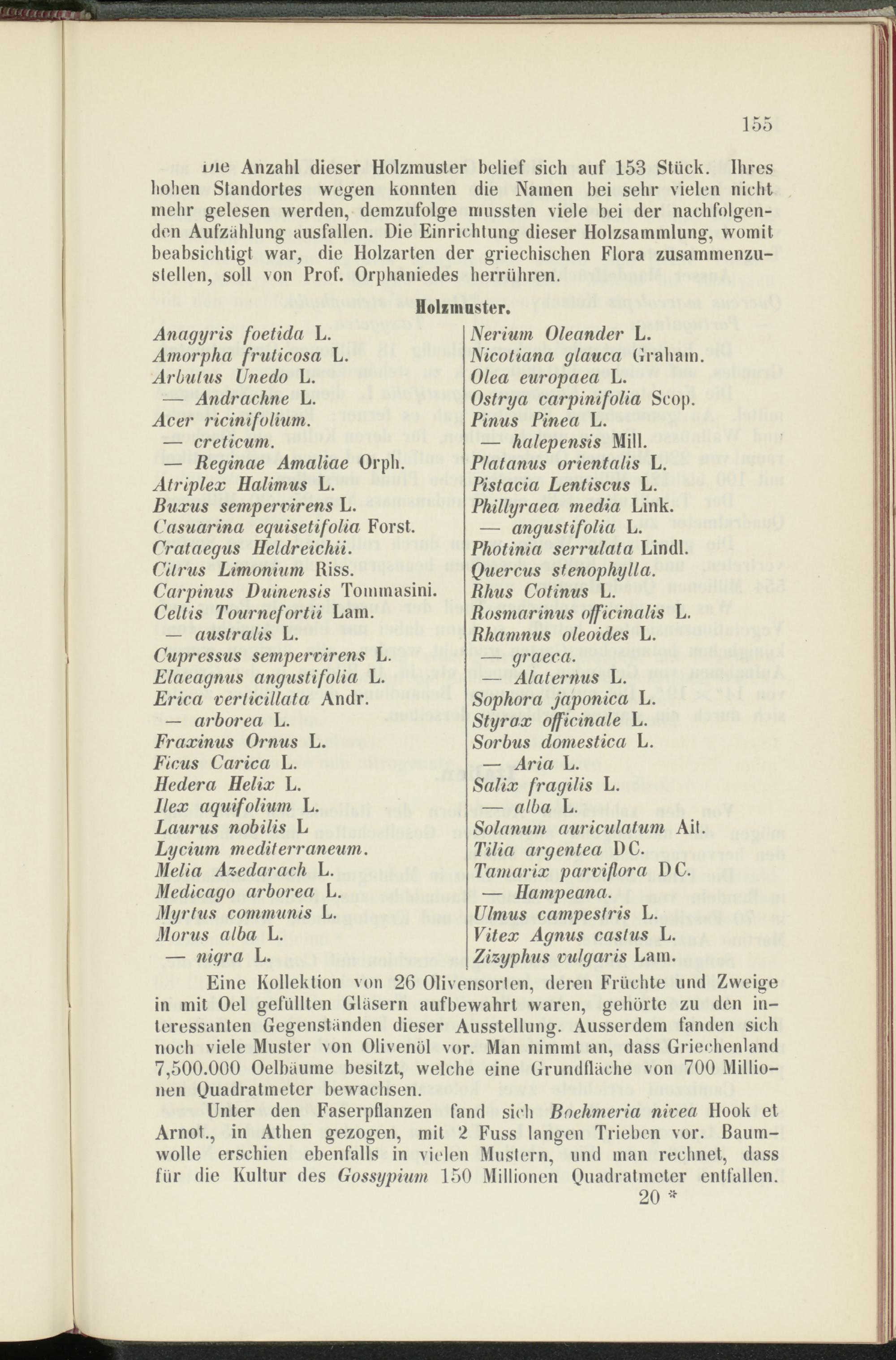uie Anzahl dieser Holzmuster belief sich auf 153 Stück. Ihres hohen Standortes wegen konnten die Namen bei sehr vielen nicht mehr gelesen werden, demzufolge mussten viele bei der nachfolgenden Aufziihlung ausfallen. Die Einrichtung dieser Holzsammlung, womit beabsichtigt war, die Holzarten der griechischen Flora zusammenzu- slellen, soll von Prof. Orphaniedes herriihren.