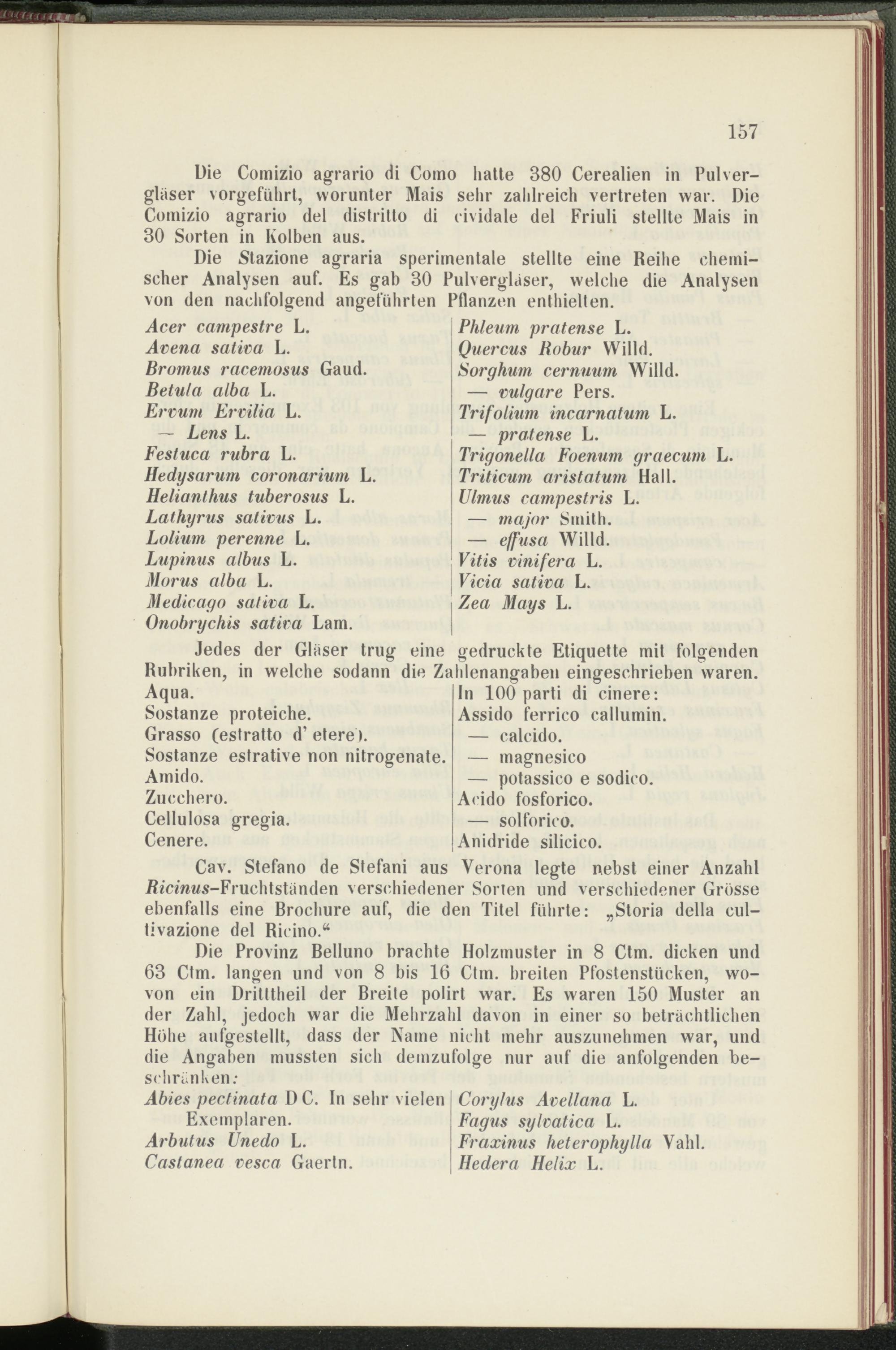 Cav. Stefano de Stefani aus Verona legte nebst einer Anzahl Äicmws-Fruchtständen verschiedener Sorten und verschiedener Grösse ebenfalls eine Brochure auf, die den Titel führte: „Storia della cul- tivazione del Ricino.“