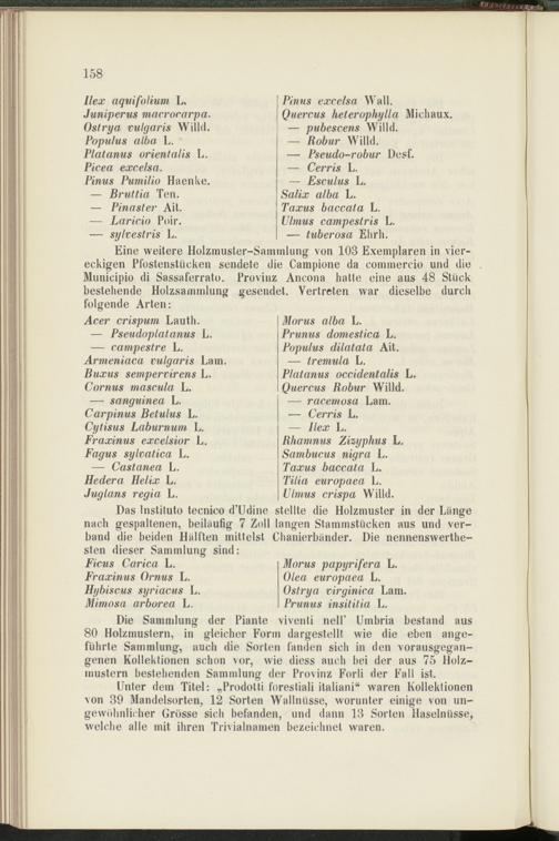 Eine weitere Holzmuster-Sammlung von 103 Exemplaren in viereckigen Pfostenstücken sendete die Campione da cornrnercio und die Municipio di Sassaferrato. Provinz Ancona hatte eine aus 48 Stück, bestehende Holzsammlung gesendet. Vertreten war dieselbe durch folgende Arten:
