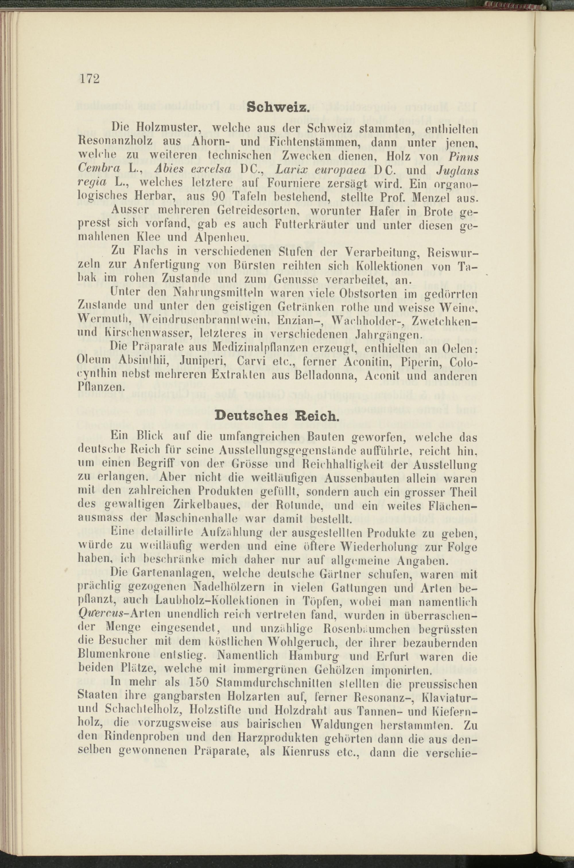 Die Holzmuster, welche aus der Schweiz stammten, enthielten Resonanzholz aus Ahorn- und Fichtenstämmen, dann unter jenen, welche zu weiteren technischen Zwecken dienen, Holz von Pinus Cernbra L., Abtes excelsa DC., Larix europaea DC. und Juglans regia L., welches letztere auf Fourniere zersägt wird. Ein organo- logisches Herbar, aus 90 Tafeln bestehend, stellte Prof. Menzel aus.