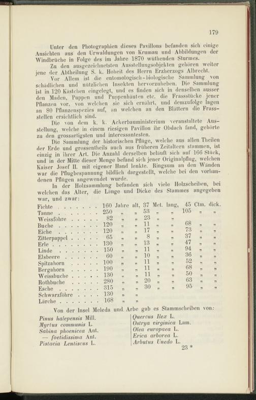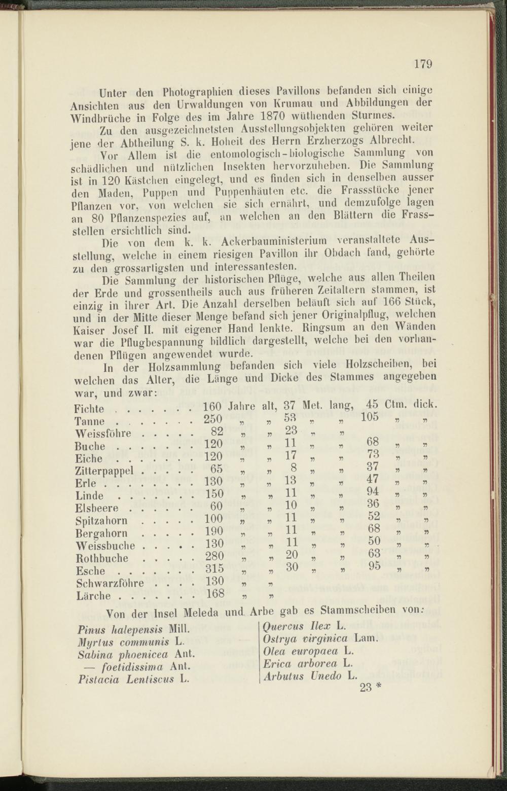 In der Holzsammlung befanden sich viele Holzscheiben, bei welchen das Alter, die Länge und Dicke des Stammes angegeben war, und zwar: