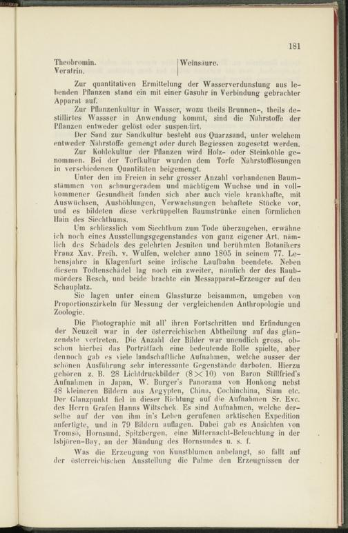 Um schliesslich vom Siechthum zum Tode überzugehen, erwähne ich noch eines Ausstellungsgegenstandes von ganz eigener Art, nämlich des Schädels des gelehrten Jesuiten und berühmten Botanikers Franz Xav. Freih. v. Wulfen, welcher anno 1805 in seinem 77. Lebensjahre in Klagenfurt seine irdische Laufbahn beendete. Neben diesem Todtenschädel lag noch ein zweiter, nämlich der des Raubmörders Resch, und beide brachte ein Messapparat-Erzeuger auf den Schauplatz.