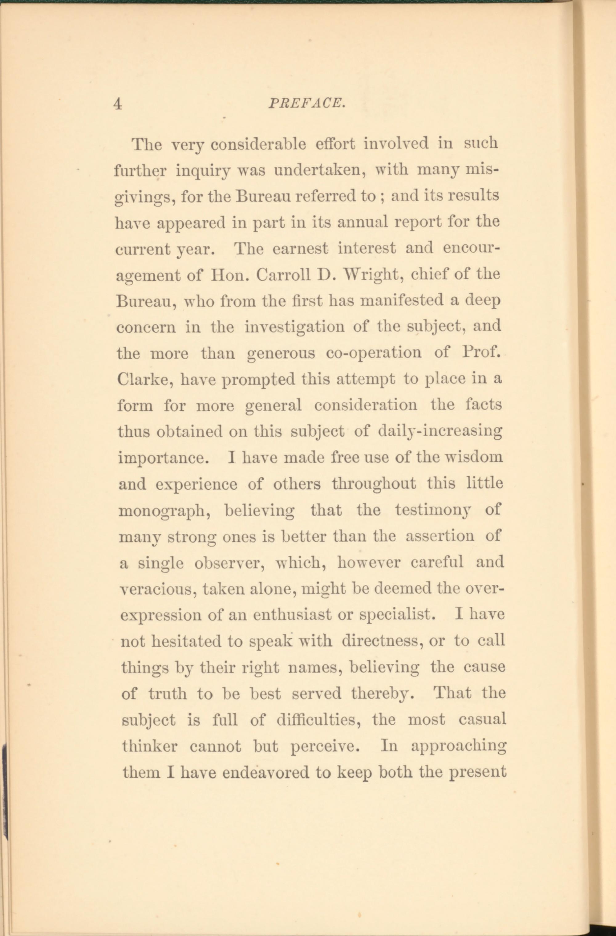 The very considerable effort involved in such further inquiry was undertaken, with many misgivings, for the Bureau referred to ; and its results have appeared in part in its annual report for the current year. The earnest interest and encouragement of Hon. Carroll D. Wright, chief of the Bureau, who from the first has manifested a deep concern in the investigation of the subject, and the more than generous co-operation of Prof. Clarke, have prompted this attempt to place in a form for more general consideration the facts thus obtained on this subject of daily-increasing importance. I have made free use of the wisdom and experience of others throughout this little monograph, believing that the testimony of many strong ones is better than the assertion of a single observer, which, however careful and veracious, taken alone, might be deemed the overexpression of an enthusiast or specialist. I have not hesitated to speak with directness, or to call things by their right names, believing the cause of truth to be best served thereby. That the subject is full of difficulties, the most casual thinker cannot but perceive. In approaching them I have endeavored to keep both the present