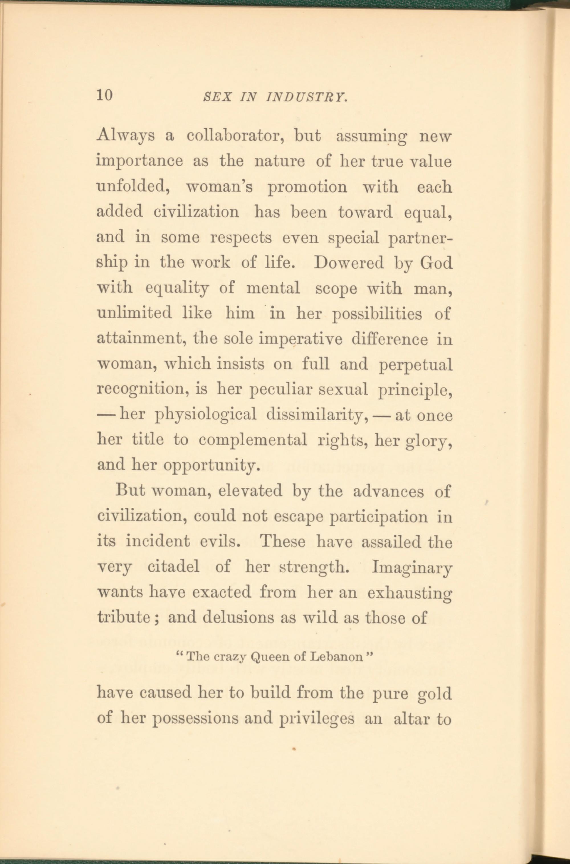 Always a collaborator, but assuming new importance as the nature of her true value unfolded, woman’s promotion with each added civilization has been toward equal, and in some respects even special partnership in the work of life. Dowered by God with equality of mental scope with man, unlimited like him in her possibilities of attainment, the sole imperative difference in woman, which insists on full and perpetual recognition, is her peculiar sexual principle, — her physiological dissimilarity, — at once her title to complemental rights, her glory, and her opportunity.