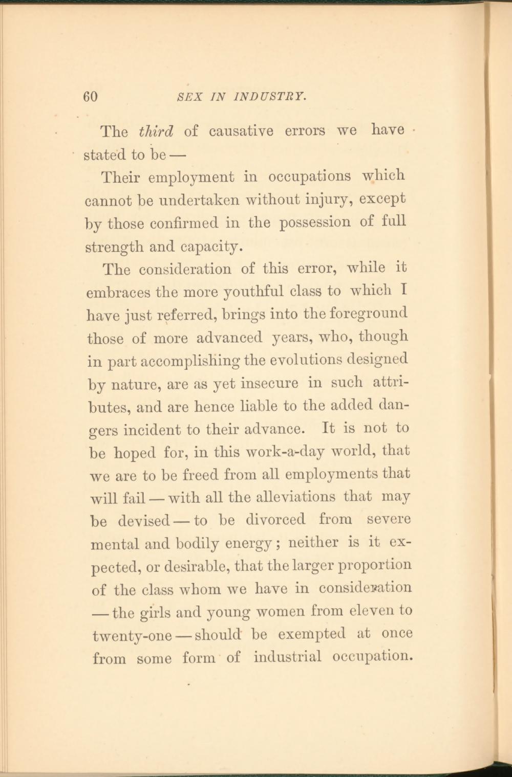 The consideration of this error, while it embraces the more youthful class to which I have just referred, brings into the foreground those of more advanced years, who, though in part accomplishing the evolutions designed by nature, are as yet insecure in such attributes, and are hence liable to the added dangers incident to their advance. It is not to be hoped for, in this work-a-day world, that we are to be freed from all employments that will fail — with all the alleviations that may be devised—to be divorced from severe mental and bodily energy; neither is it expected, or desirable, that the larger proportion of the class whom we have in consideration — the girls and young women from eleven to twenty-one — should be exempted at once from some form of industrial occupation.